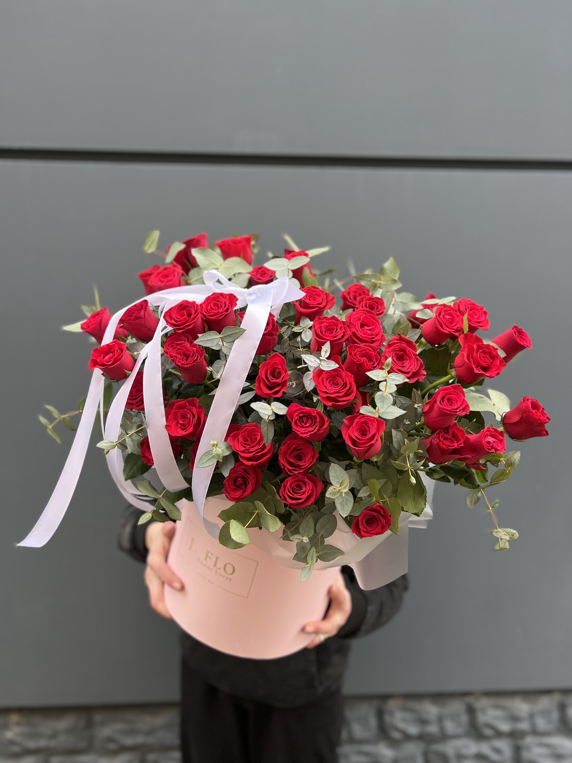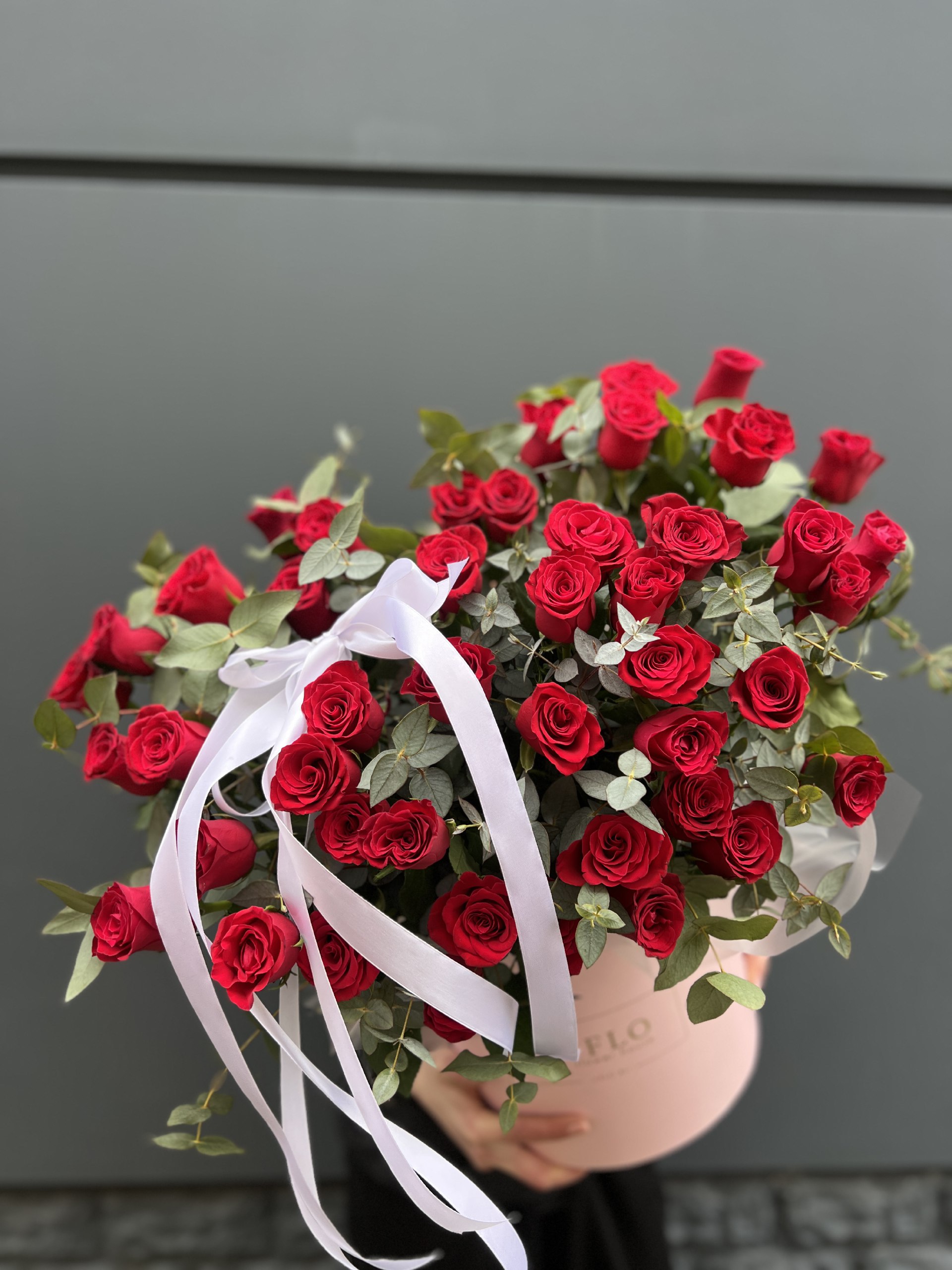 Сто один бутон образует плотную красную сферу с безупречной геометрией. Кенийская роза отличается густотой лепестков и насыщенным оттенком который не теряет глубину даже при ярком свете. Букет держит форму и впечатляет масштабом.