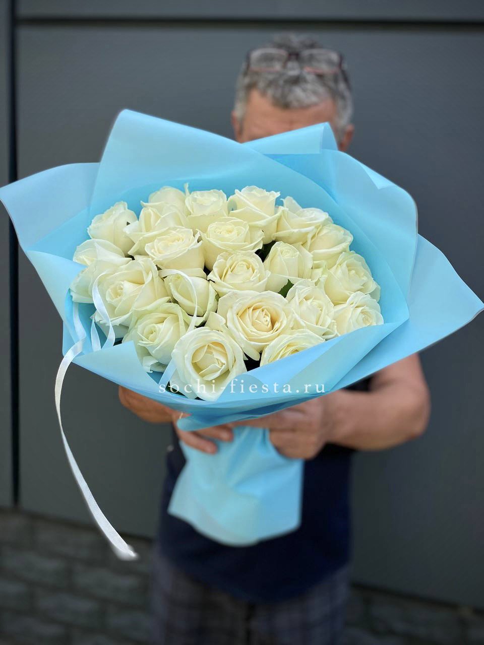 Пятнадцать белых роз собраны в компактный бокс с ветками эвкалипта. Чистая форма и спокойная гамма создают ощущение воздуха и света в любом пространстве.