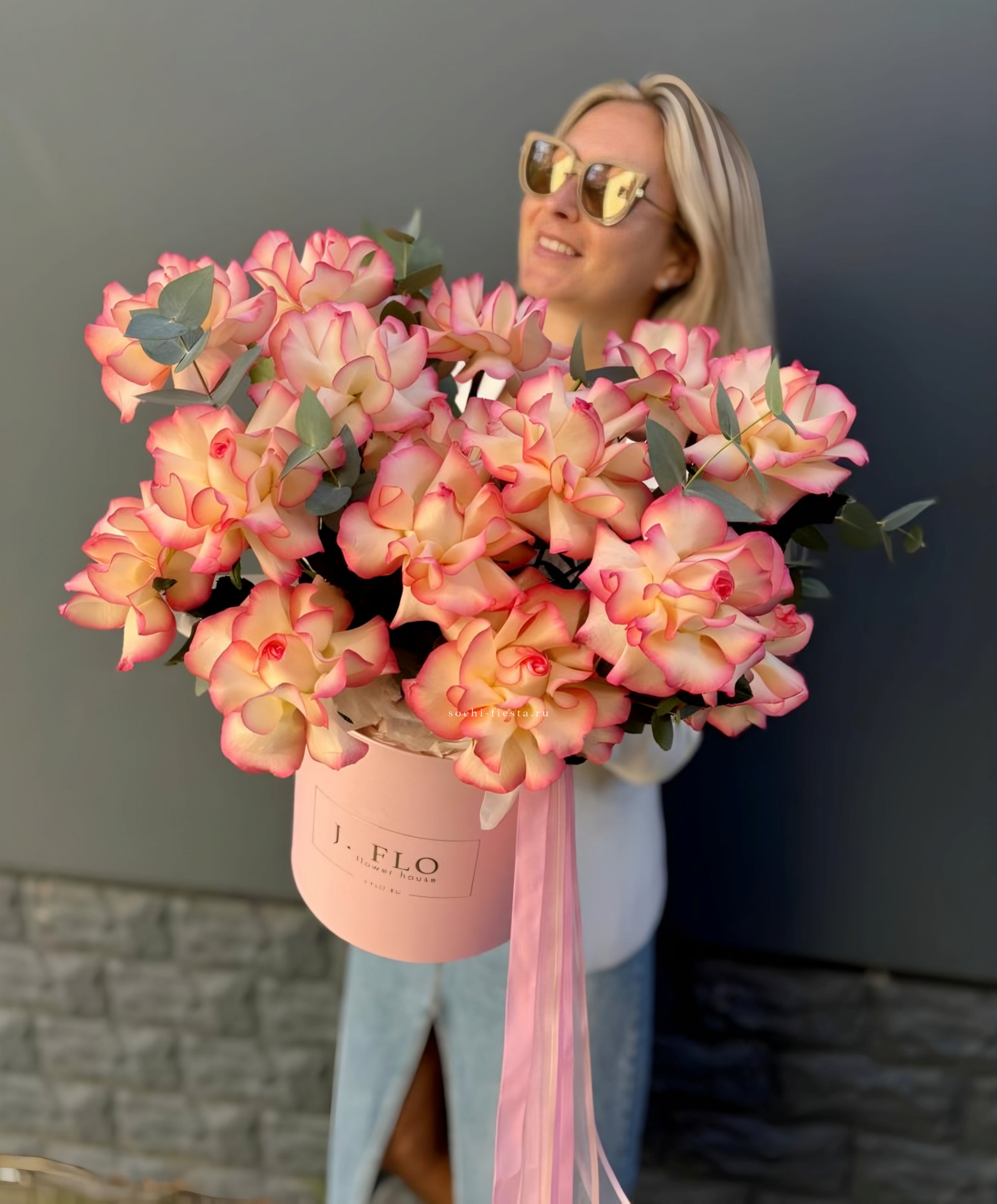 вывернутые розы Джумилия, цилиндр D20, эвкалипт, лента, упаковка.