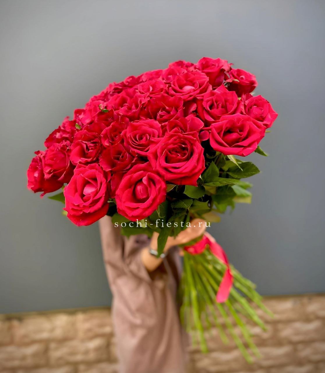 Пятьдесят пять бутонов собраны в плотную округлую форму, где каждый цветок читается отдельно. Красный здесь звучит насыщенно и глубоко, создавая мощное визуальное присутствие. Букет держит форму и занимает пространство уверенно.