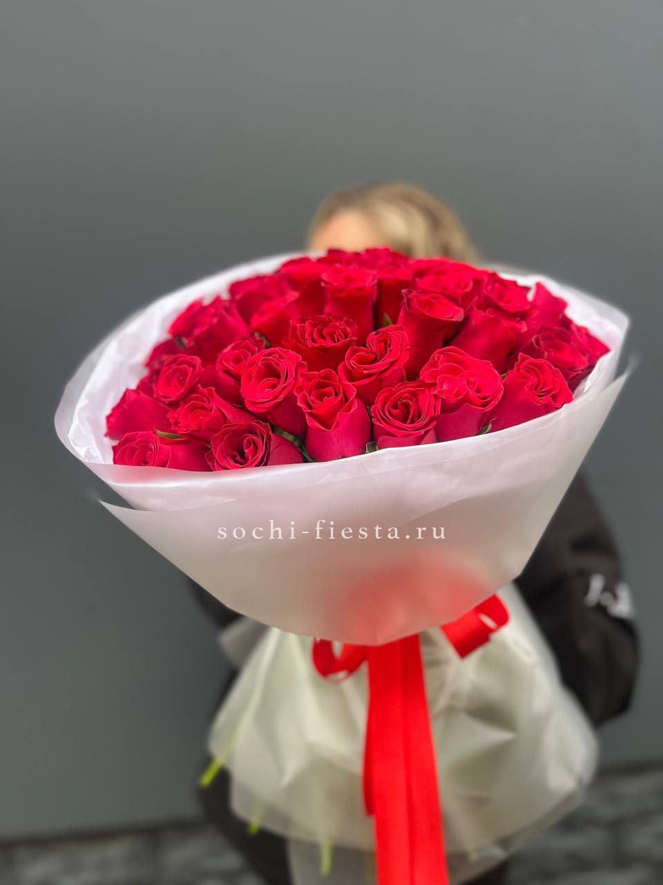 55 красных роз, лента, упаковка.