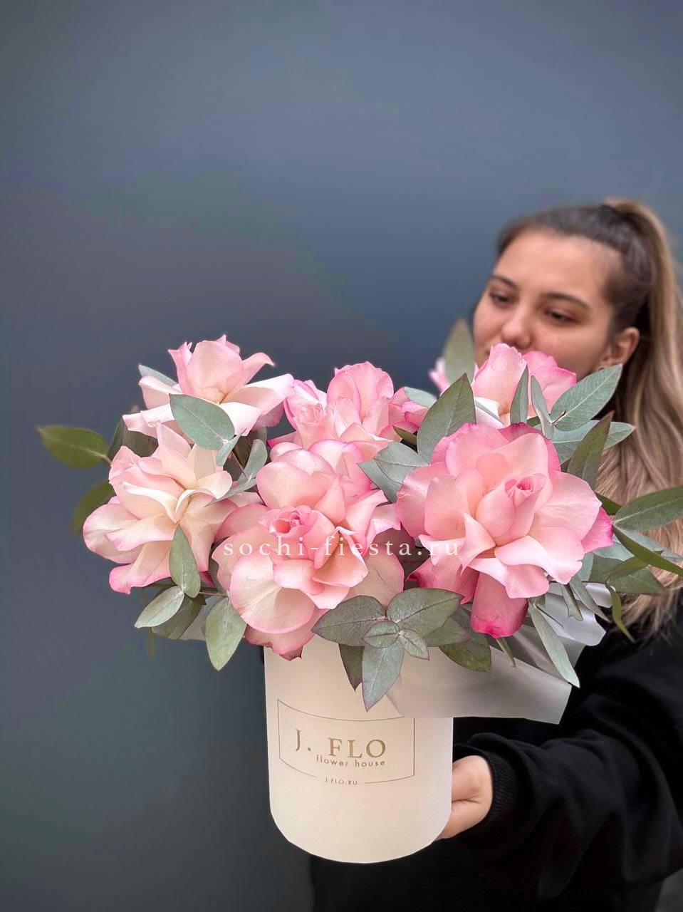 вывернутые розы, цилиндр D13, эвкалипт, лента, упаковка.