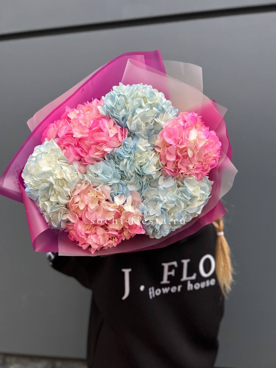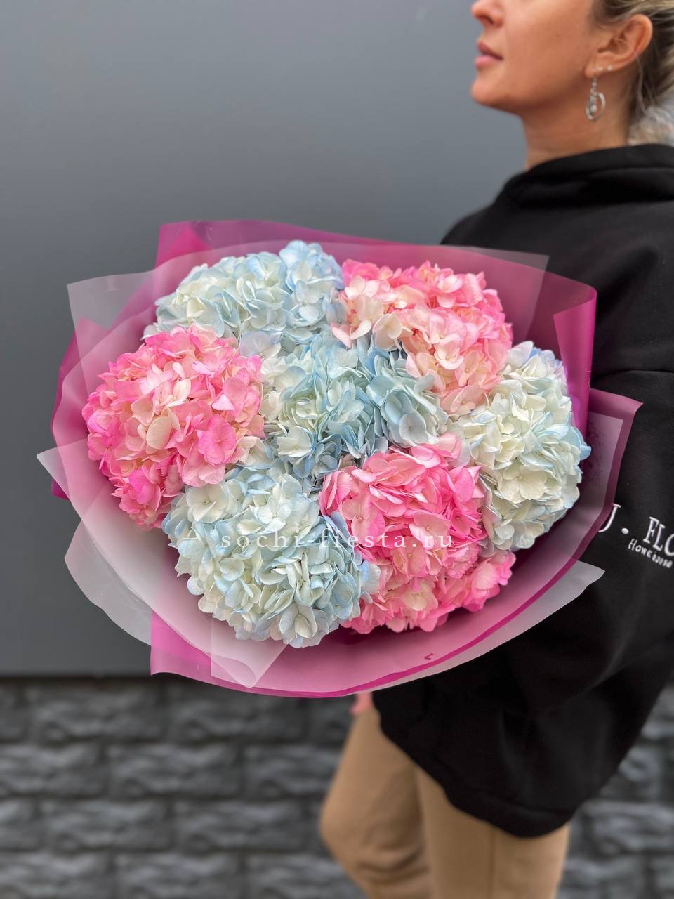Гортензия и пионовидные розы создают густую округлую форму с мягкими переходами оттенков. Диантус добавляет воздушные вкрапления между крупными бутонами. Композиция в сумке-кашпо держит силуэт и выглядит цельно.