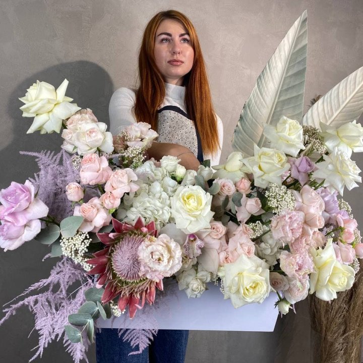 Авторские букеты гиганты в Вологде — формат для тех событий в жизни города, когда обычного букета недостаточно. Юбилей 50 лет, свадьба, открытие бизнеса, значимое корпоративное поздравление — именно к таким поводам клиент заказывает гигантский авторский букет, который невозможно не заметить. Флорист в Вологде создаёт авторские букеты гиганты из 101 и более роз, пионовые гиганты в сезоне, корзины-гиганты для торжественных вручений. Именно масштаб флористического жеста делает момент незабываемым для получателя и всех присутствующих.