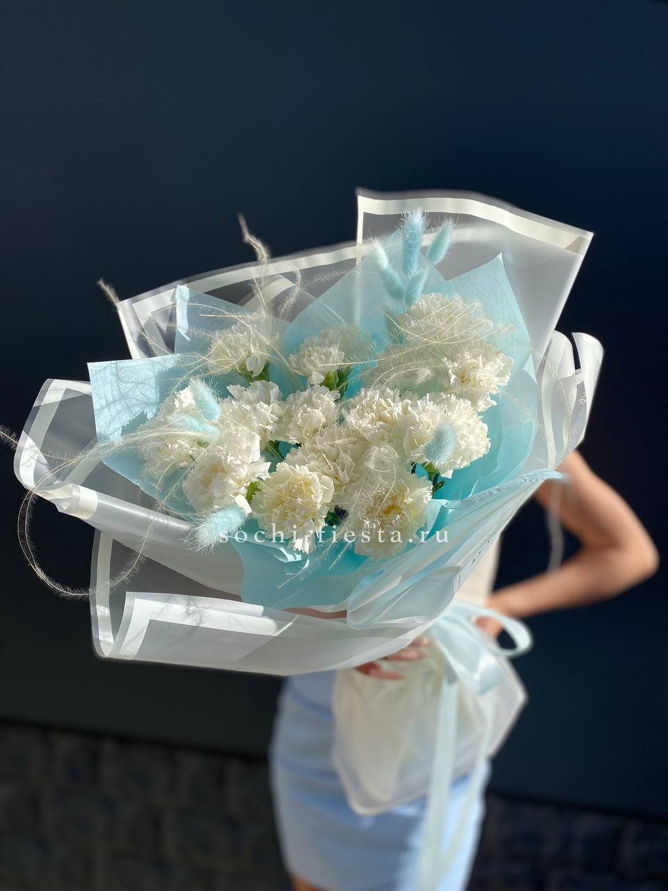 15 белых диантусов,ковыль,лагурус, эвкалипт, лента, дизайнерская пленка.
