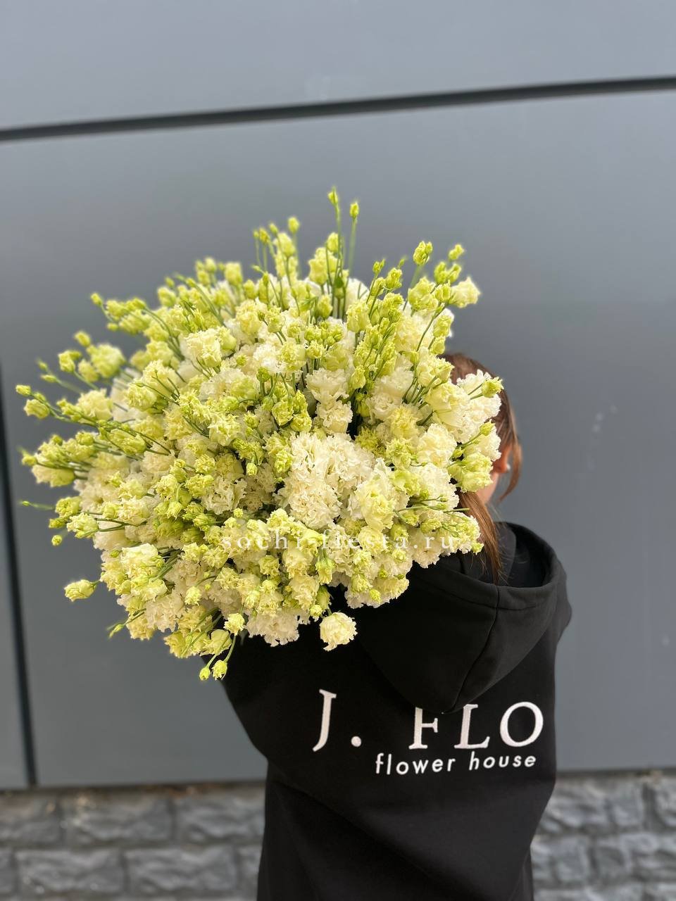 Монохромная композиция из белоснежных эустом в количестве пятидесяти одной штуки. Масштабная сборка впечатляет чистотой линий и графичным присутствием в пространстве.