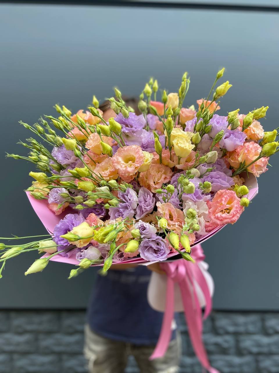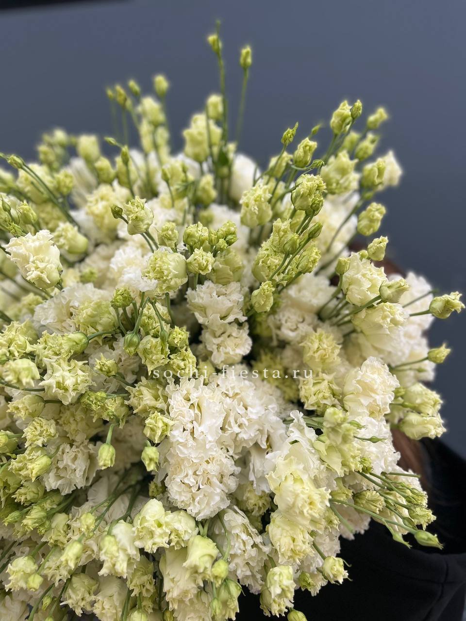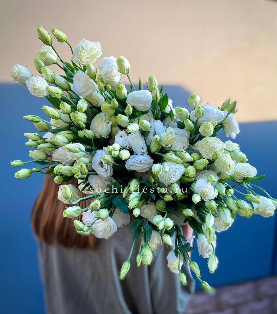 Сто один стебель белоснежной эустомы с многоярусными бутонами собраны в воздушный букет. Каждый цветок напоминает миниатюрную розу и вместе они образуют лёгкую скульптурную форму.