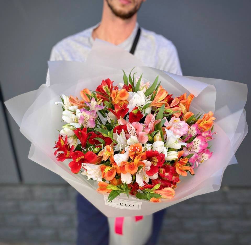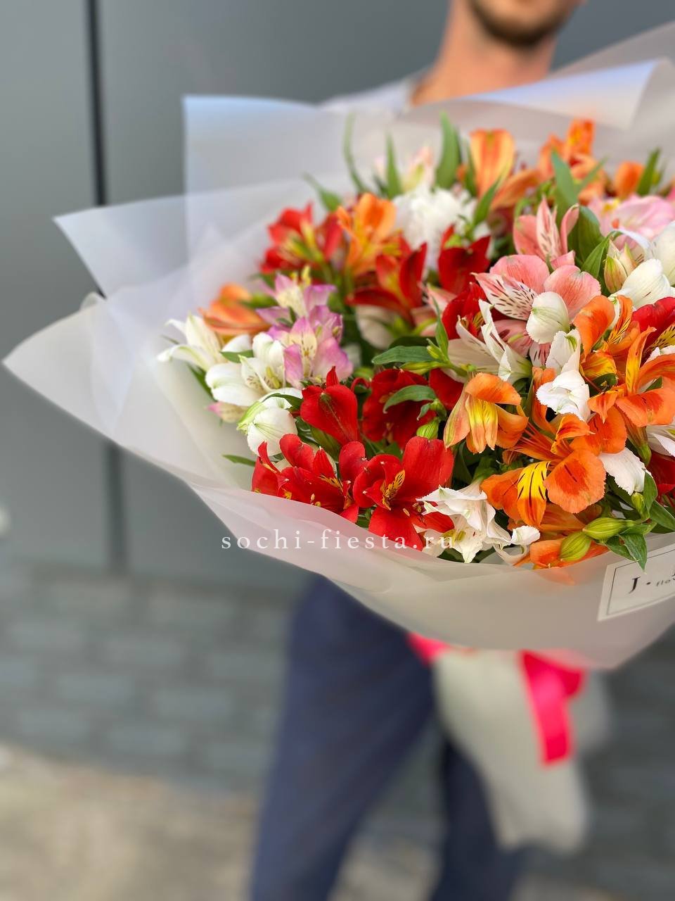 Двадцать одна ветка альстромерии образует плотный объём и насыщенную игру красок. Многоцветные соцветия распускаются волнами, создавая живописное движение внутри композиции.