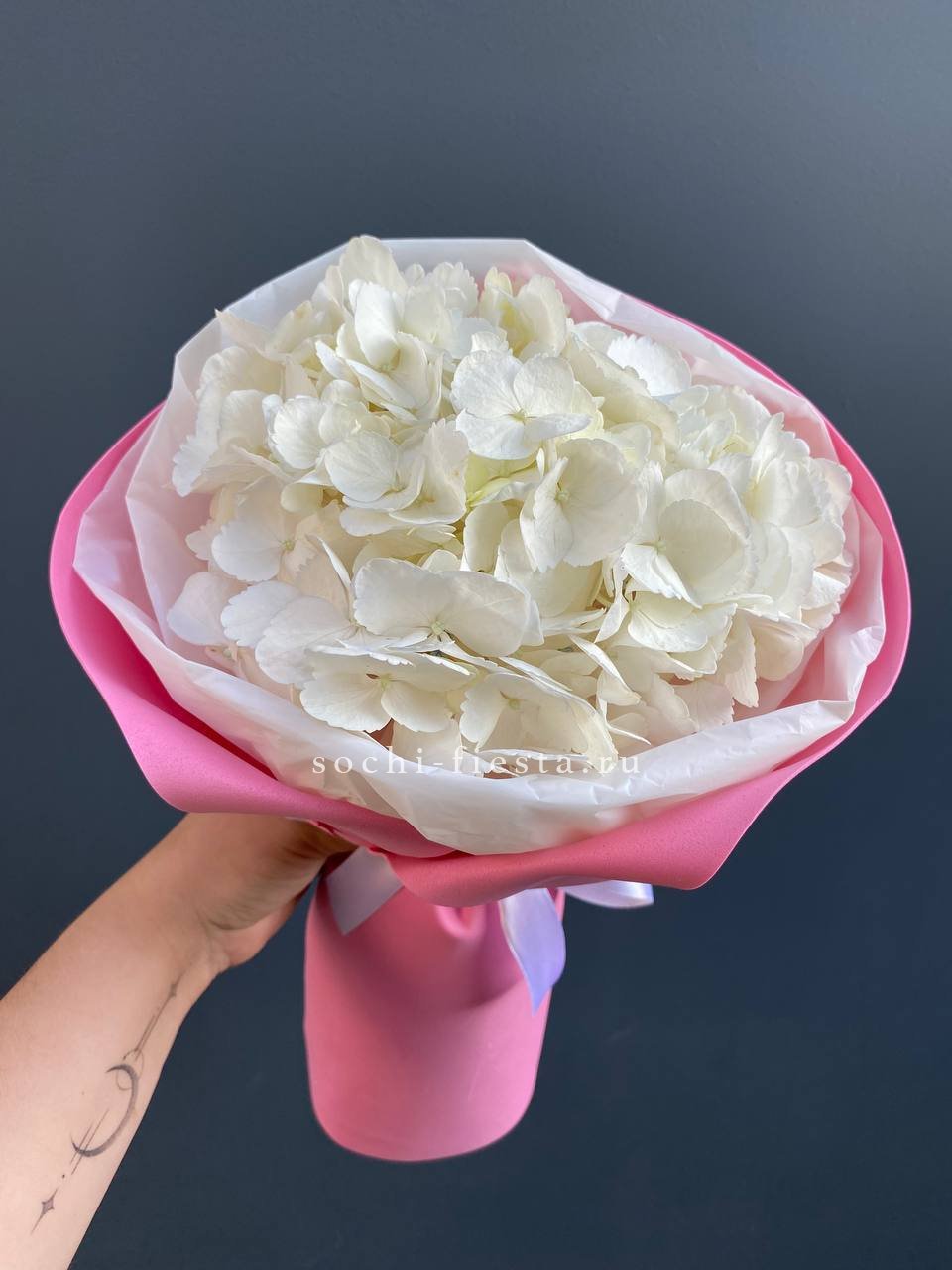 Белоснежное соцветие гортензии с плотной структурой и чистым тоном. Универсальный вариант для минималистичных интерьеров и спокойных решений.
