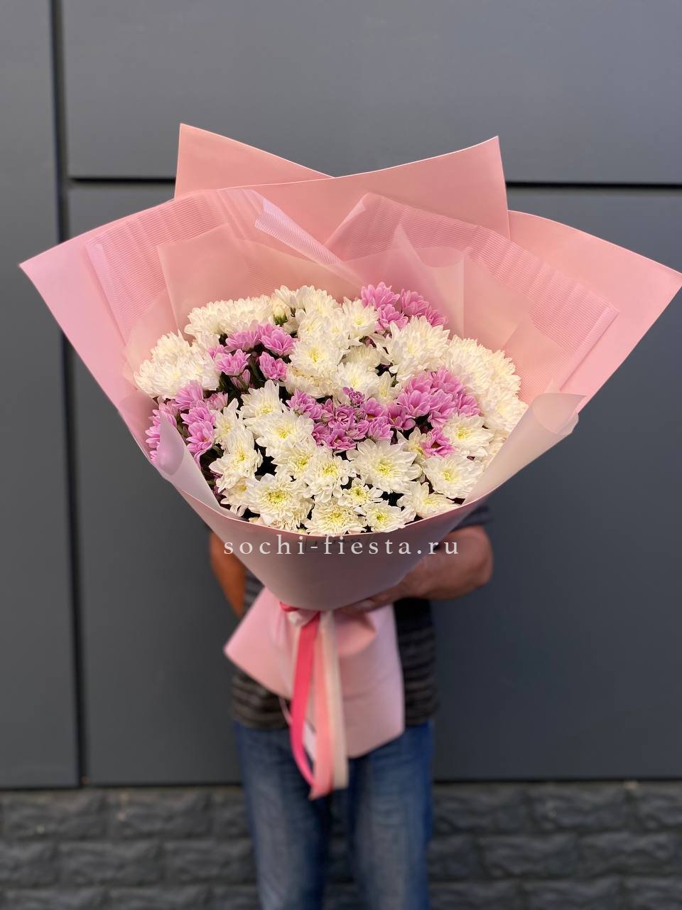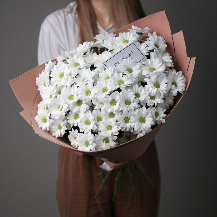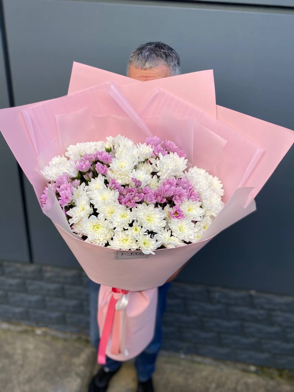 Семь пышных соцветий хризантемы с игривыми завитыми лепестками собраны в плотную композицию. Золотистый эвкалипт добавляет теплое мерцание и завершает образ. Яркий жест для тех, кто любит выразительные формы и живую энергию цветов.