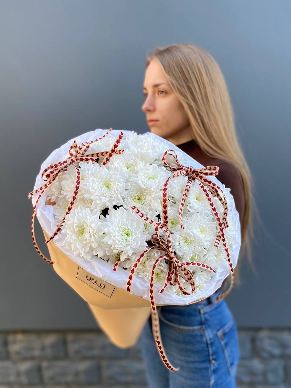 хризантема одноголовая - 9 шт., хамелациум, 5-7 шт., лента, дизайнерская упаковка.