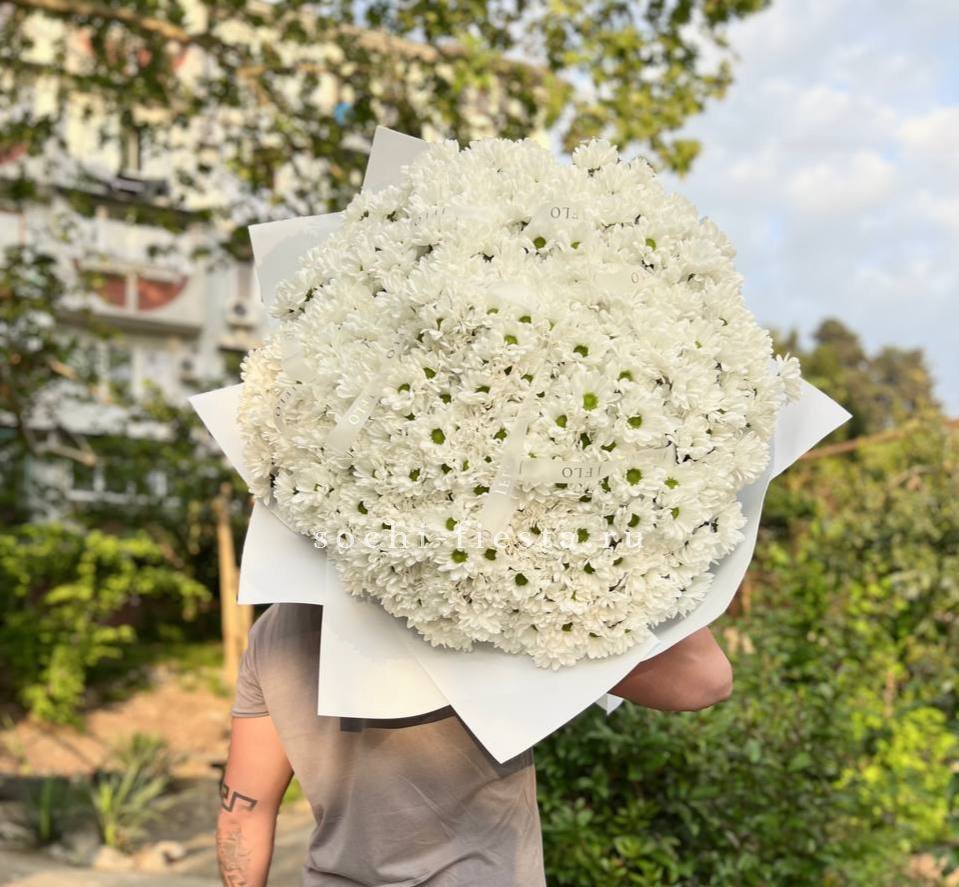 Тридцать девять белоснежных хризантем образуют плотное облако с чёткими графичными линиями. Крупные соцветия создают объёмную структуру, которая держит форму и привлекает внимание своей архитектурой.