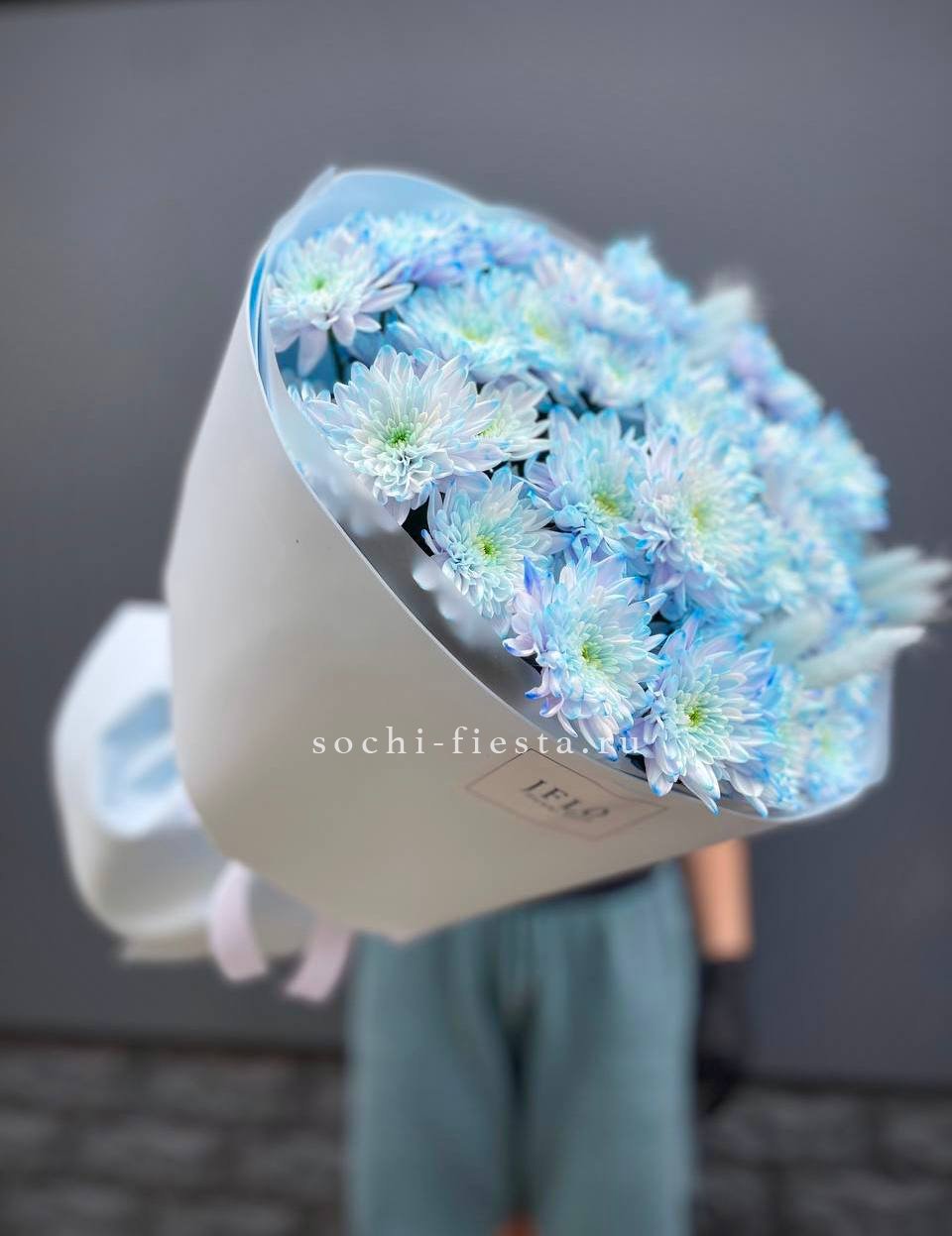 Пятнадцать веток кустовой хризантемы в натуральном крафте. Множество мелких соцветий формируют пышную шапку с естественной россыпью бутонов, подчёркнутую простотой оформления.