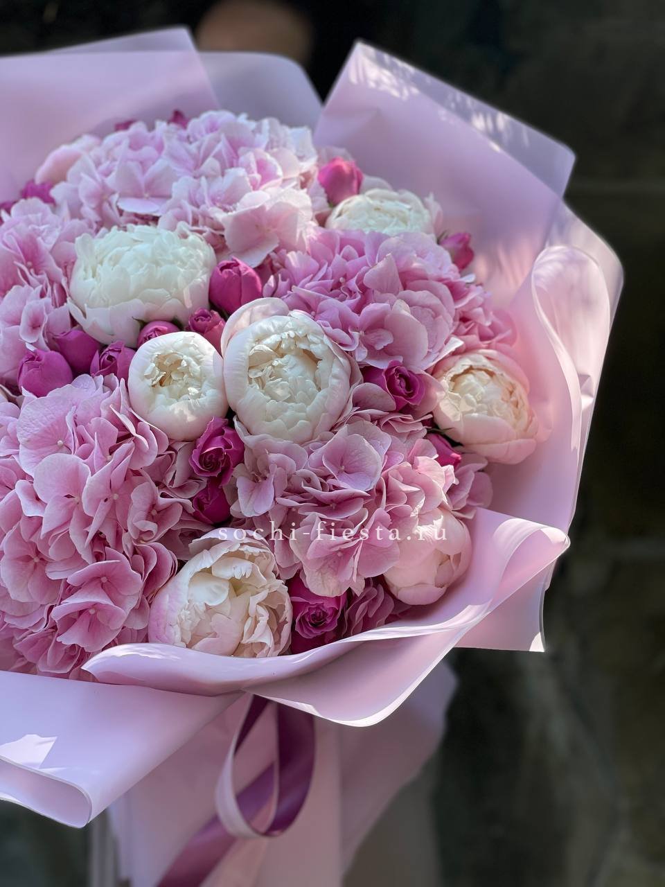 пионовидная роза Мисти Баблс, гортензия, голландские пионы, лента, упаковка.