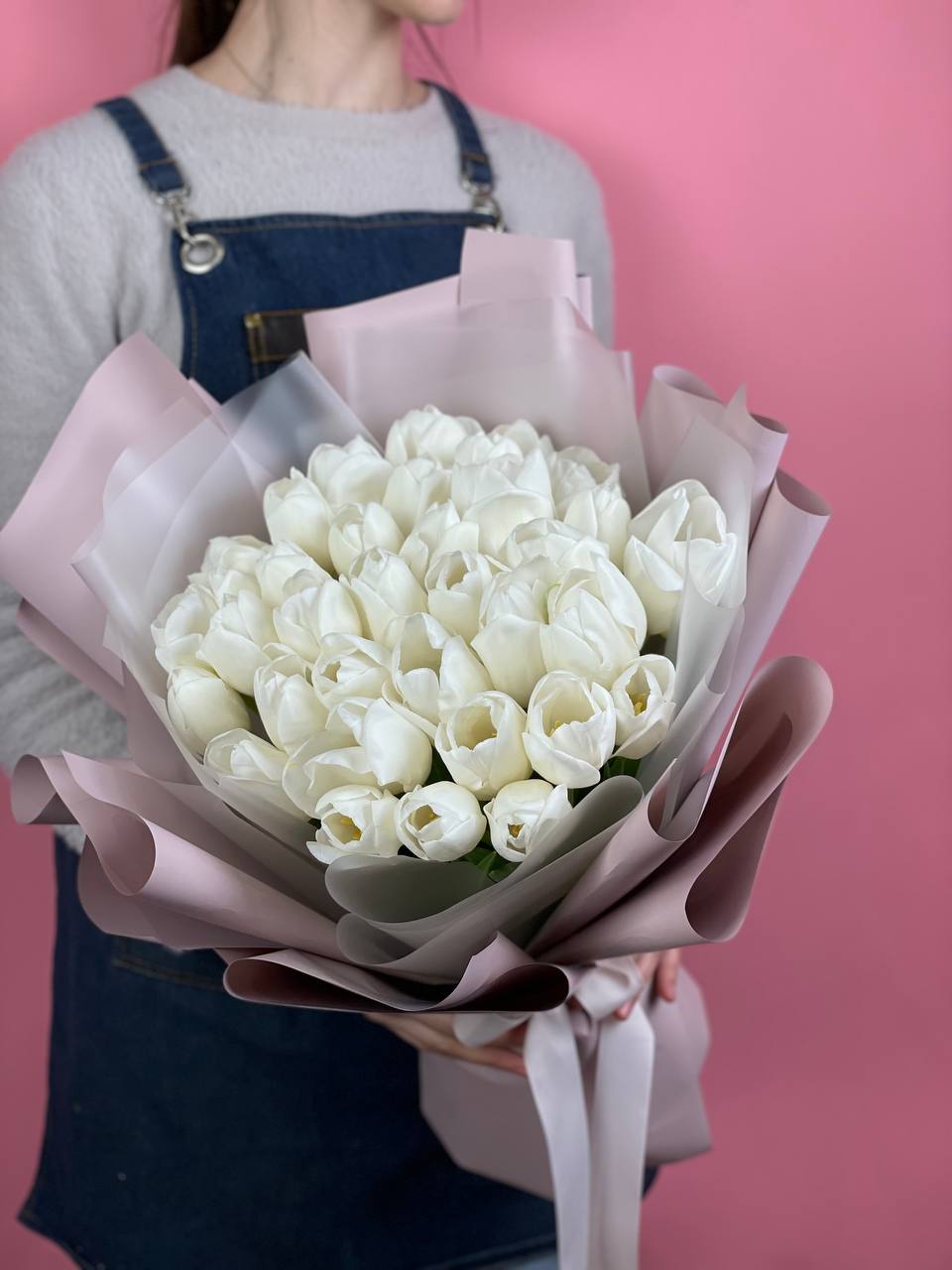 изначальная цена указана за букет из 15 тюльпанов Состав букета на фотографии: 35 тюльпанов, лента, упаковка.