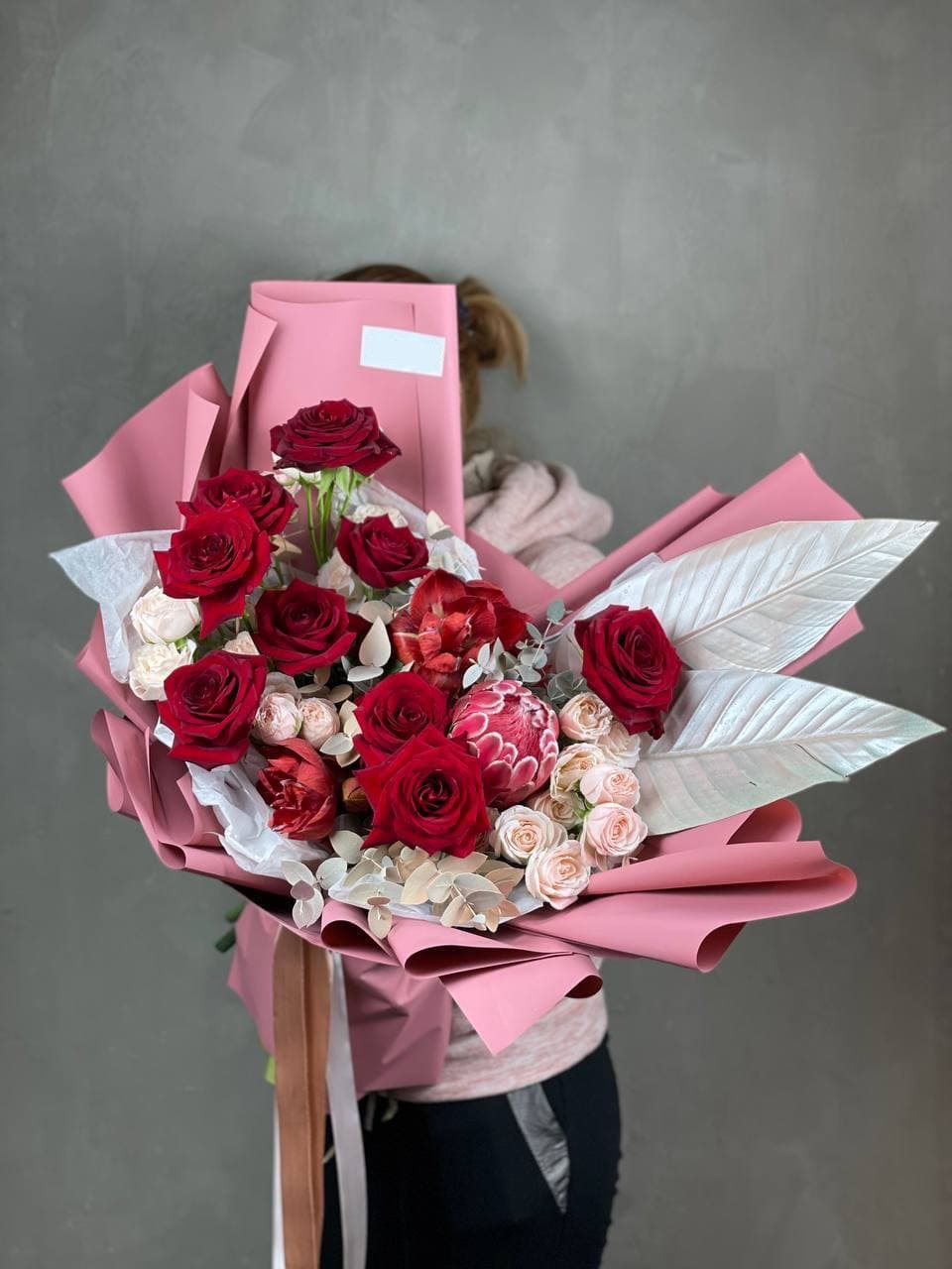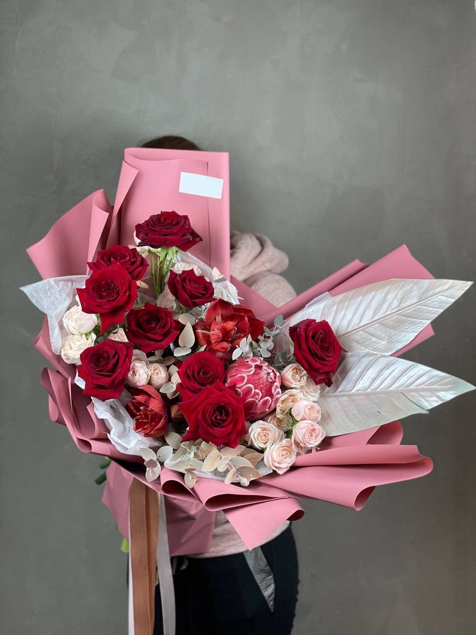 протея, роза кустовая, эустома, диантус, роза одноголовая, эвкалипт, озотамнус (по сезону) лента, дизайнерская упаковка.