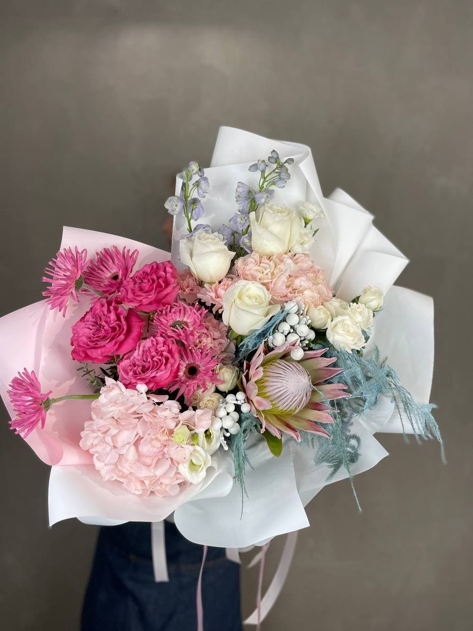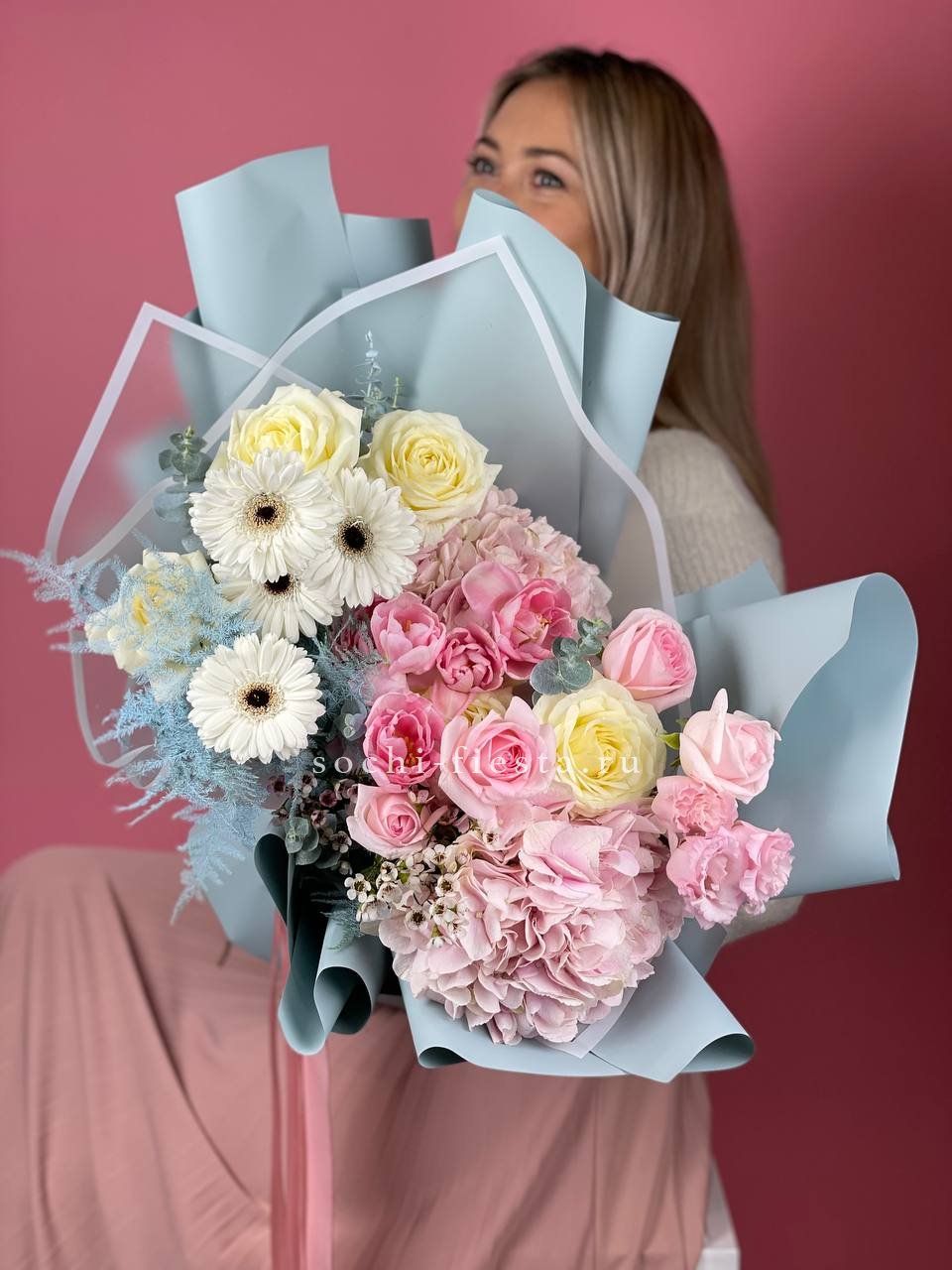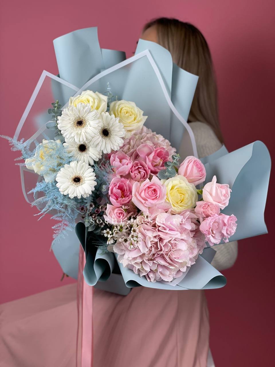 голубая хризантема, розовые розы, герберы, диантусы, лимониум, лента и дизайнерская упаковка бабочка.