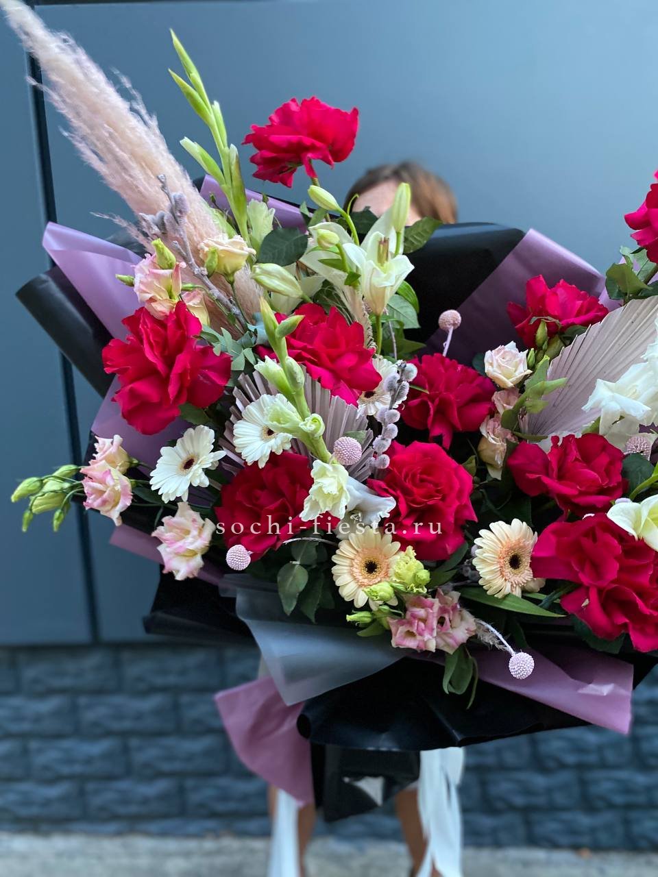 розы, герберы, эустомы, лилии, гладиолус (замена в несезон), пампасная трава, эвкалипт, упаковка, лента.