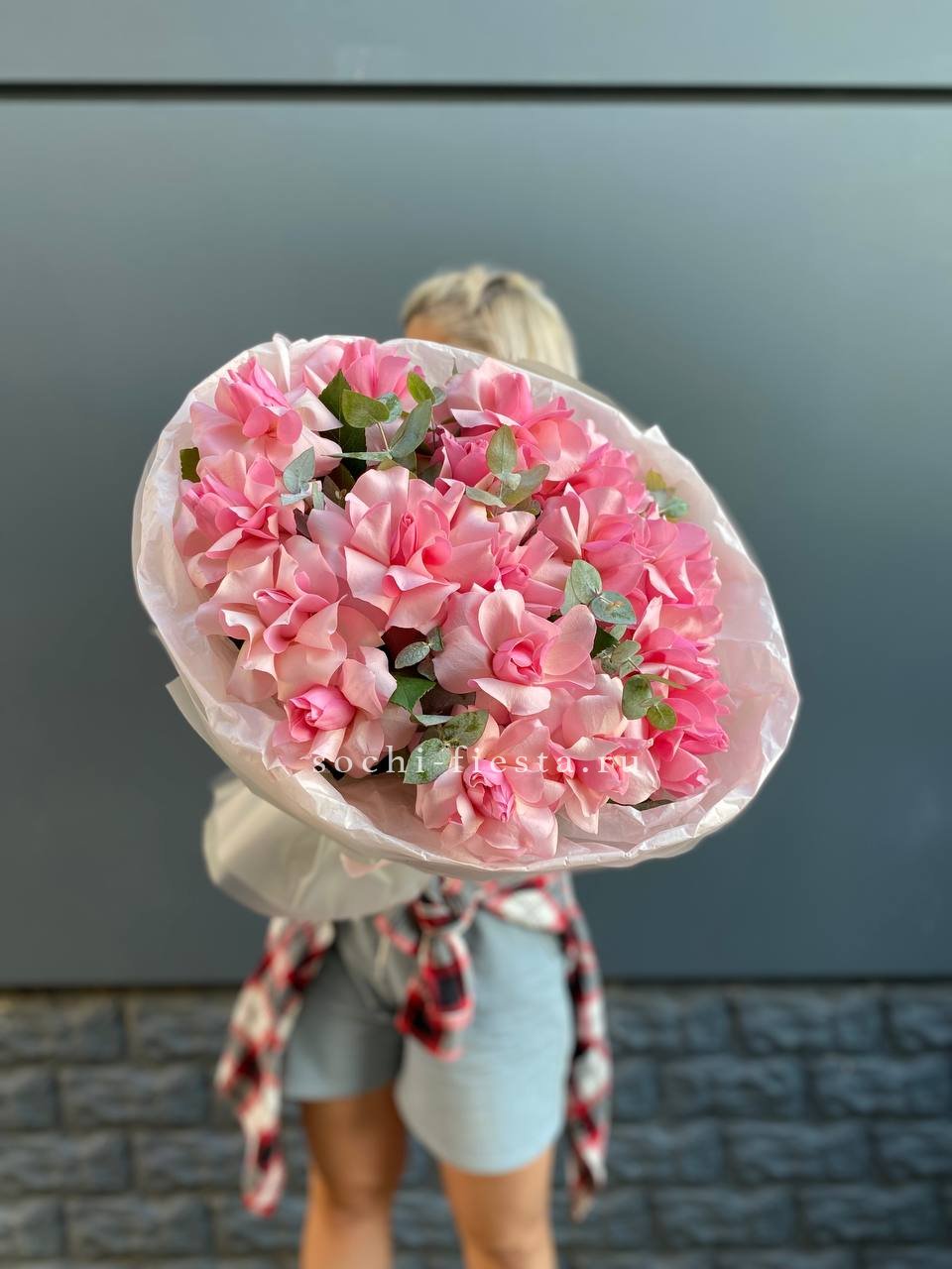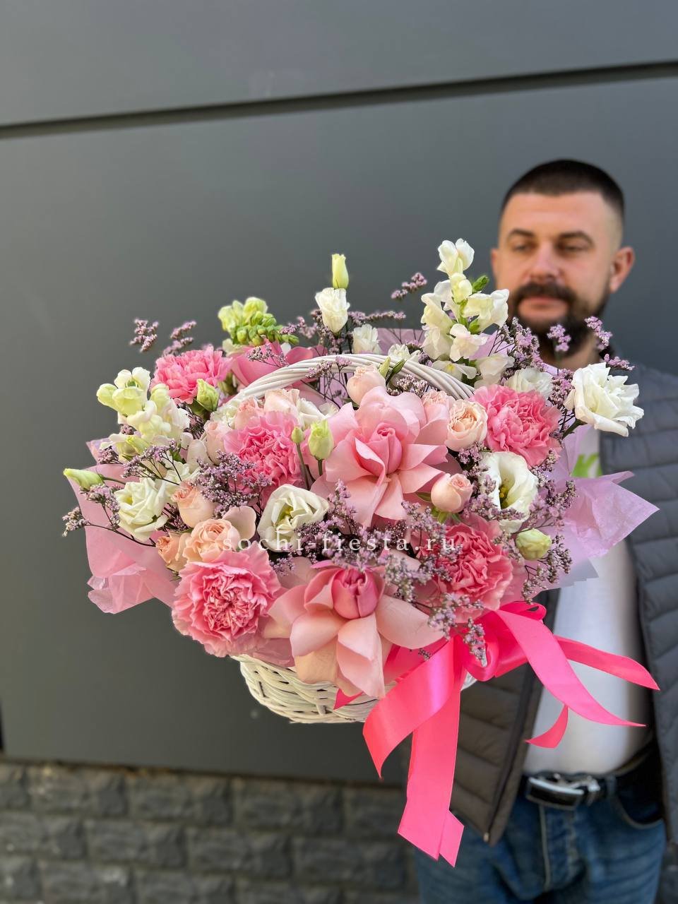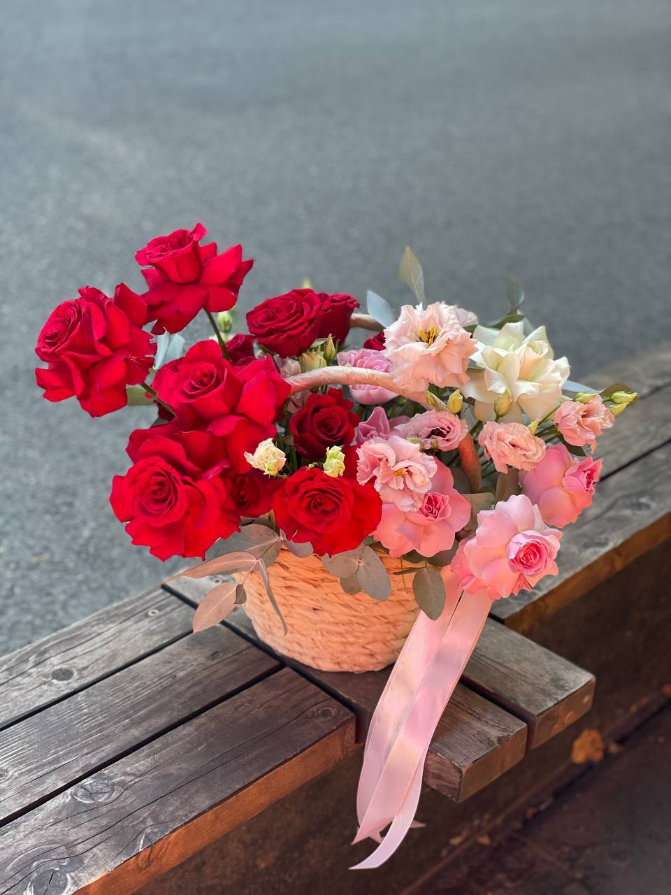 Розовые и алые головки роз собраны в плетёную корзину вместе с воздушной эустомой и серебристым эвкалиптом. Композиция держит форму и легко помещается на столе или комоде.