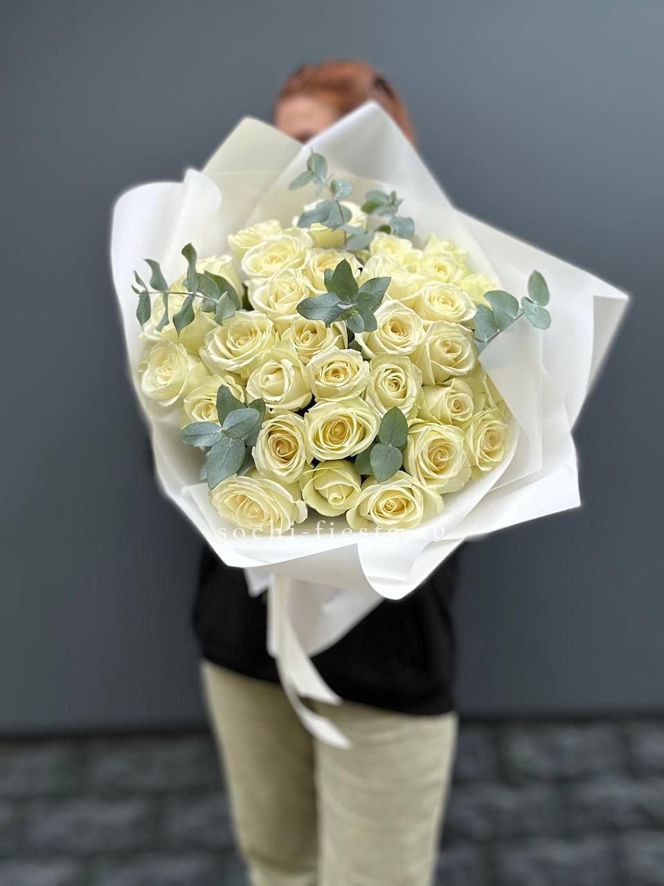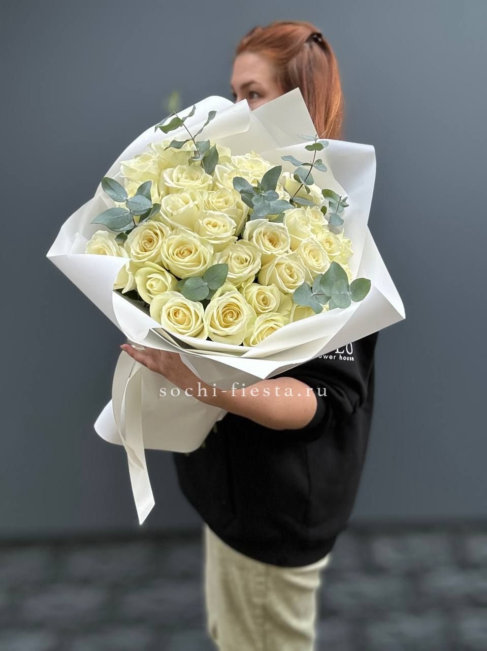 Белоснежные головки роз раскрываются постепенно и держат форму несколько дней. Монохромная гамма вписывается в минималистичный интерьер и современную эстетику.