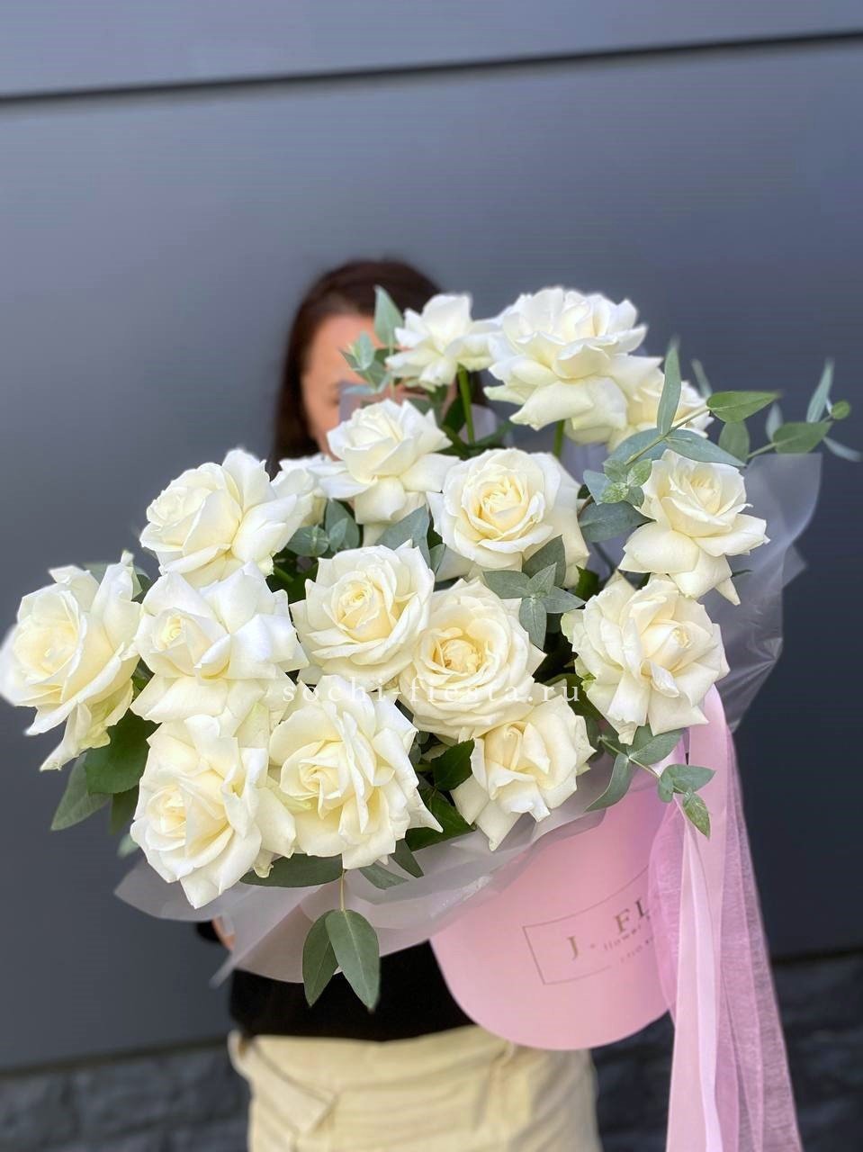 Белые розы и эустома образуют монохромную гамму с чистыми линиями. Эвкалипт добавляет свежести и завершает лаконичную форму композиции.