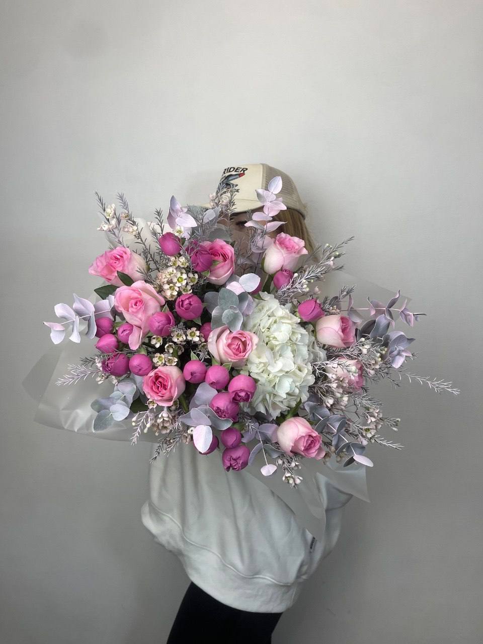 Белые розы и эустомы перекликаются с пастельными соцветиями гортензии, а озотамнус добавляет фактурные акценты. Эвкалипт обрамляет композицию серебристыми нотами.