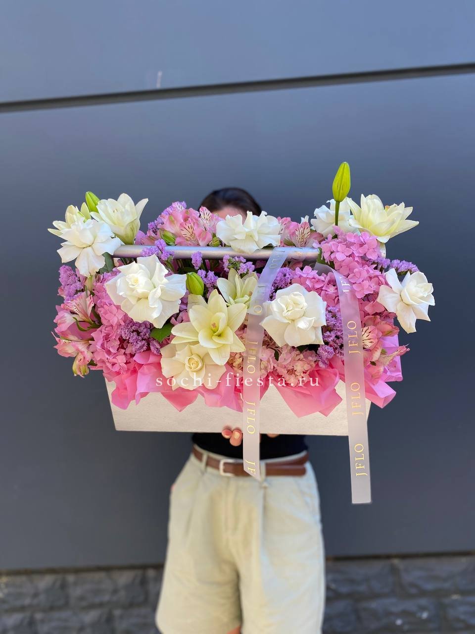 Лилии задают вертикальный ритм композиции, а французские розы и гортензия заполняют объем мягкими переходами формы. Альстромерия и статица добавляют графичности общему силуэту.