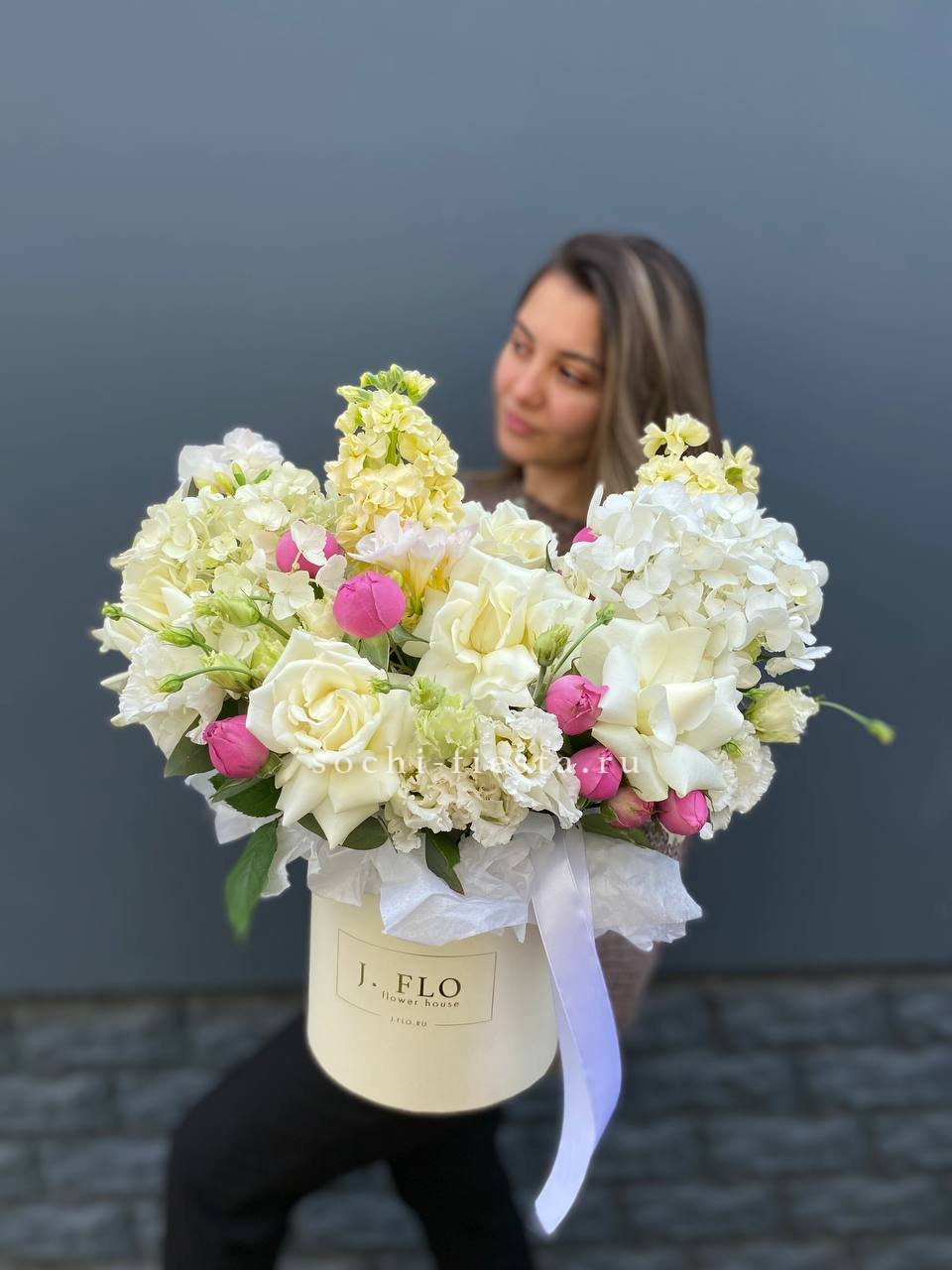 белые французские розы, эустома, гортензия, маттиола,  цилиндр D16.