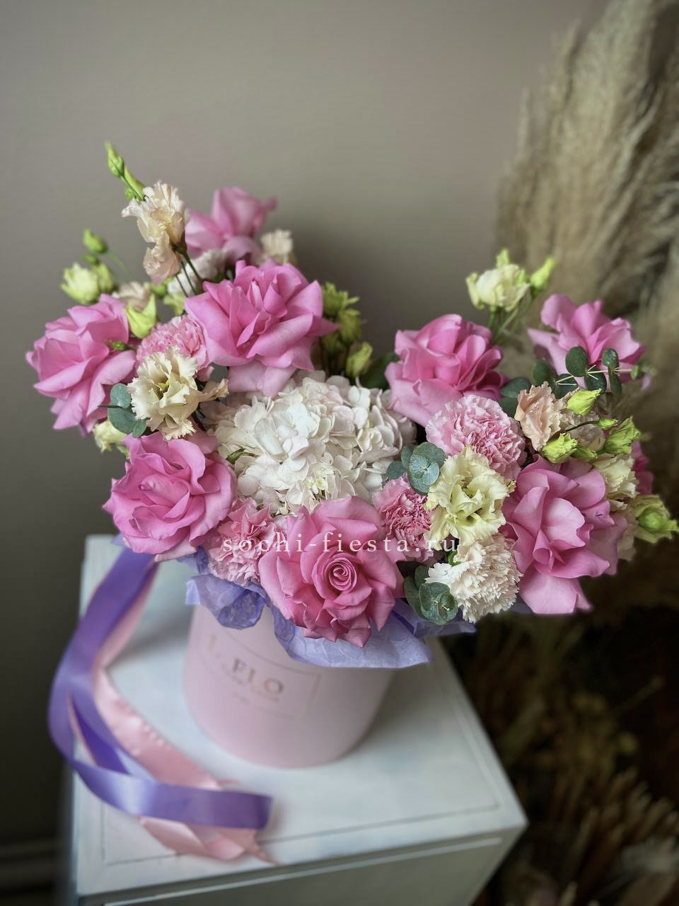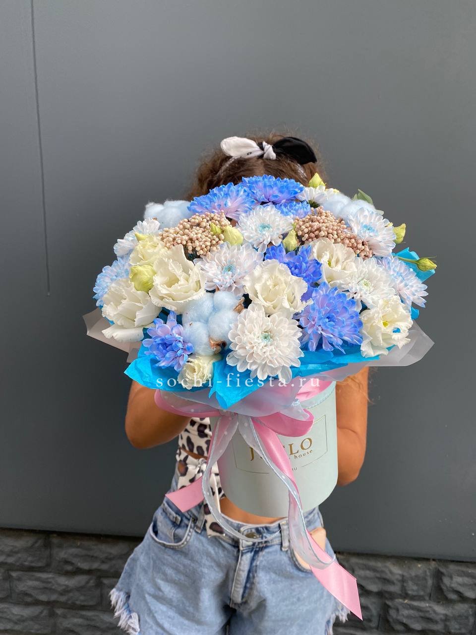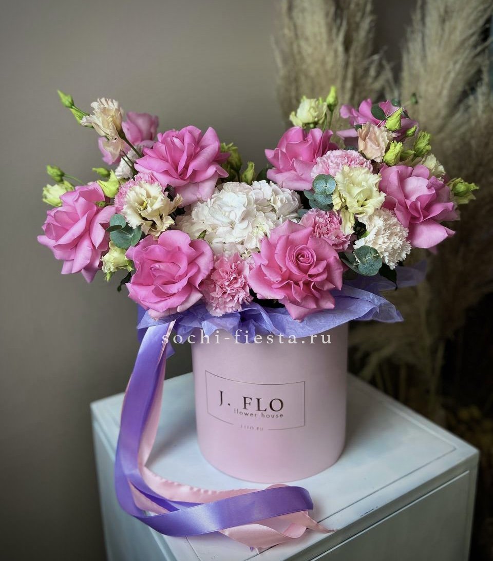 Розы, герберы и пышные соцветия гортензии в розово-голубой гамме наполняют бокс свежестью и легкостью. Каждый цветок раскрывается по-своему, создавая многослойную композицию. Готовое решение для яркого момента.