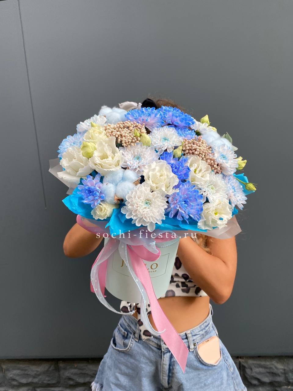 бокс из нежных розово-голубых цветов, розы, герберы, гортензии.
