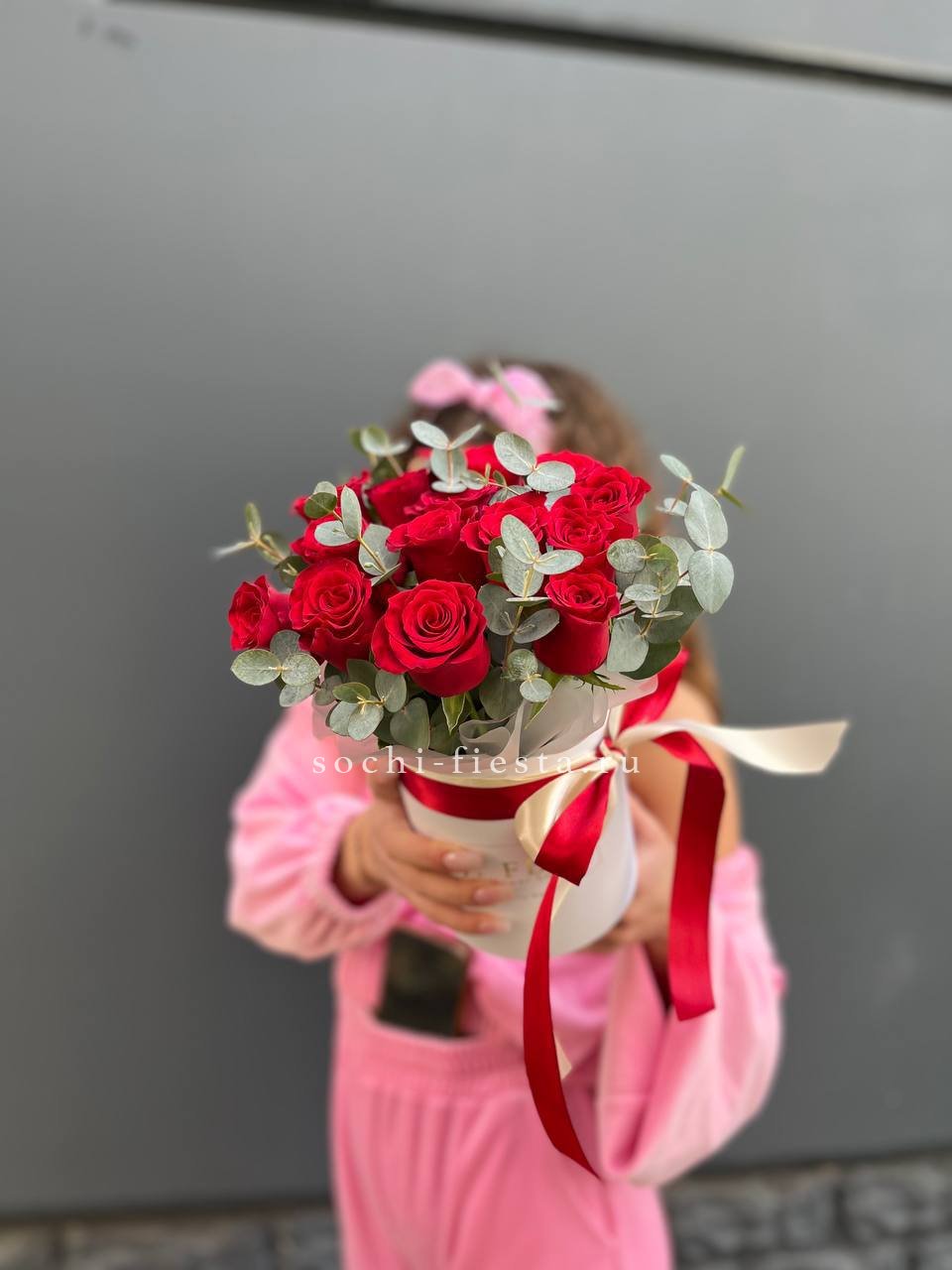 Пятнадцать красных роз уложены ровным куполом в круглом цилиндре. Ветки эвкалипта обрамляют бутоны и добавляют зеленые акценты по краю композиции.