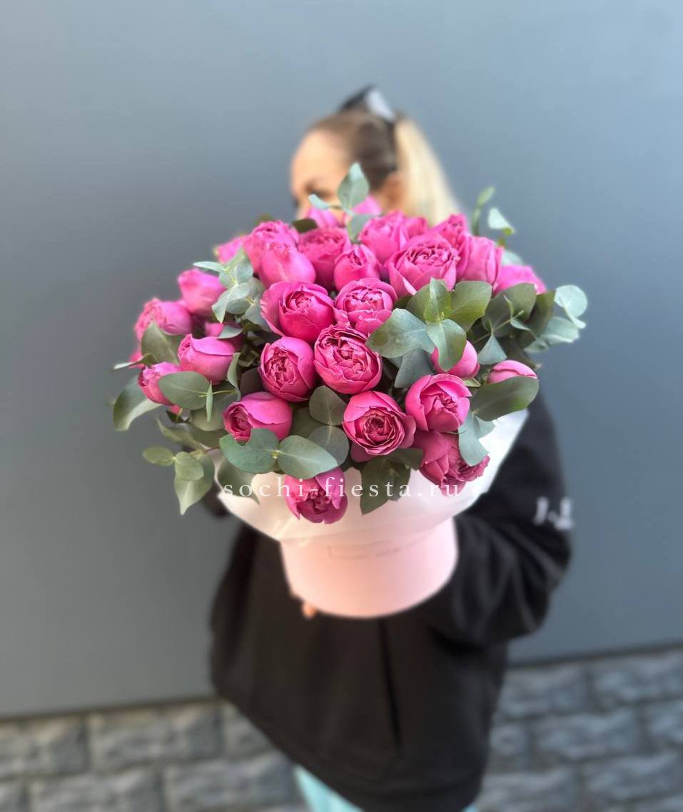 пионовидные кустовые розы 25 шт., эвкалипт, зелень, лента, цилиндр D20.
