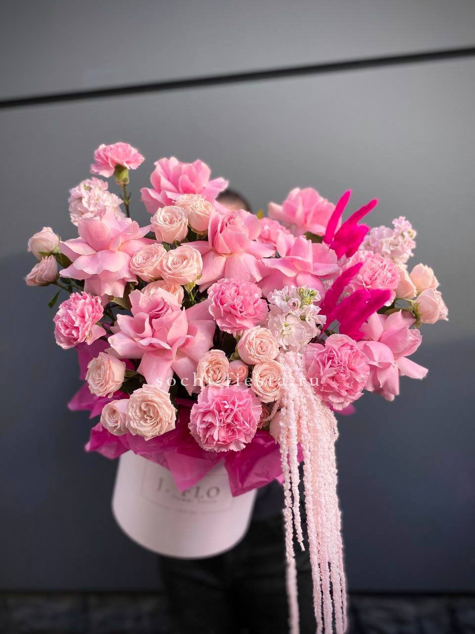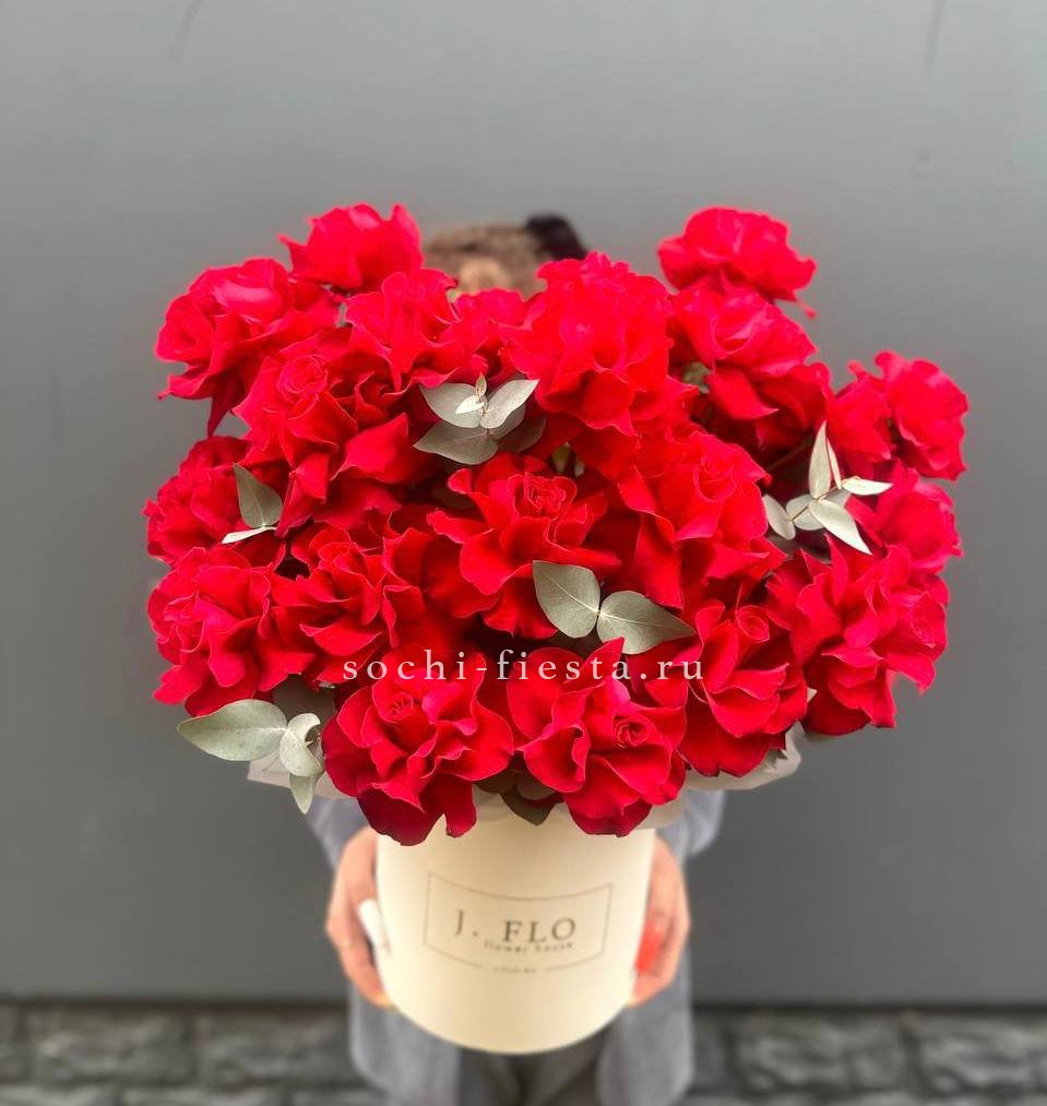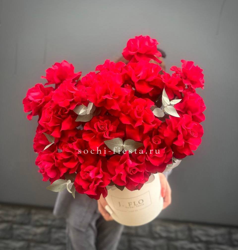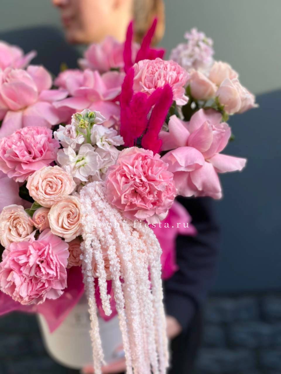 роза, диантус, пионы или гортензия, розы, бомбастик, эустома, декоративная зелень, цилиндр D16.