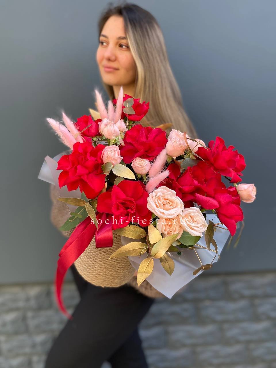 красная роза, бомбастик, лагурус, золотой эвкалипт, джутовое кашпо.