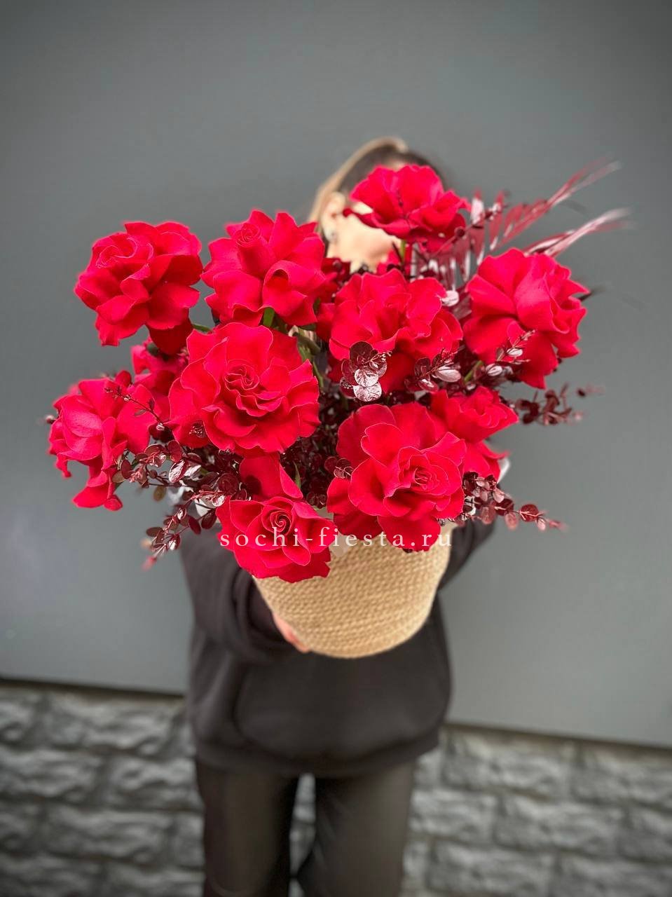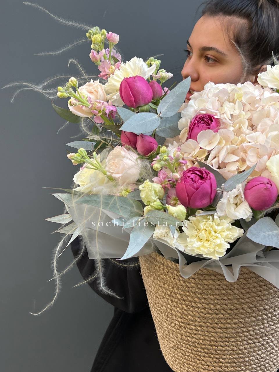 Воздушная гортензия окружает розы пудровых и снежных оттенков, а эвкалипт добавляет глубину и свежесть. Композиция собрана в натуральное джутовое кашпо, которое удобно разместить на столе или подоконнике.