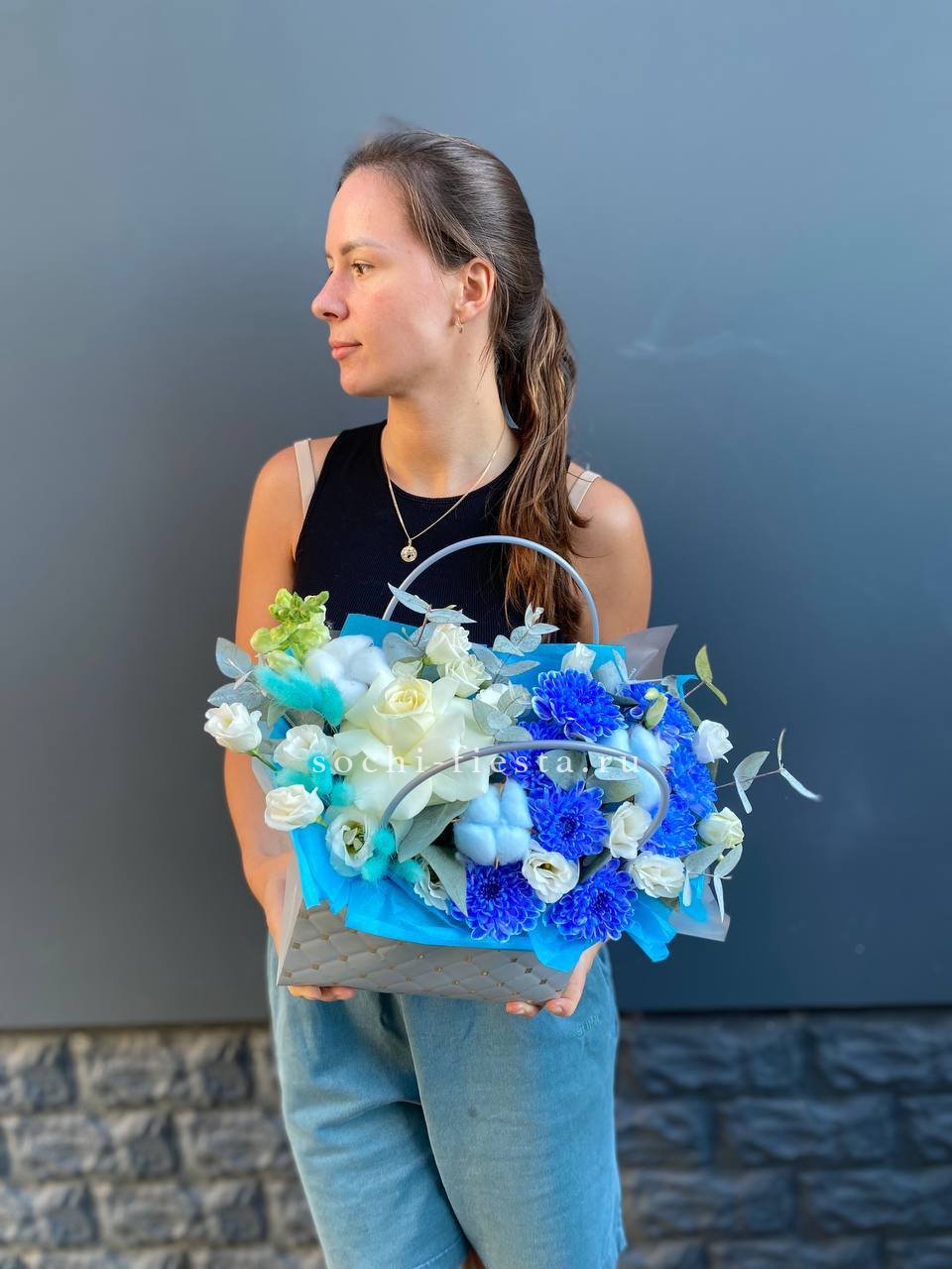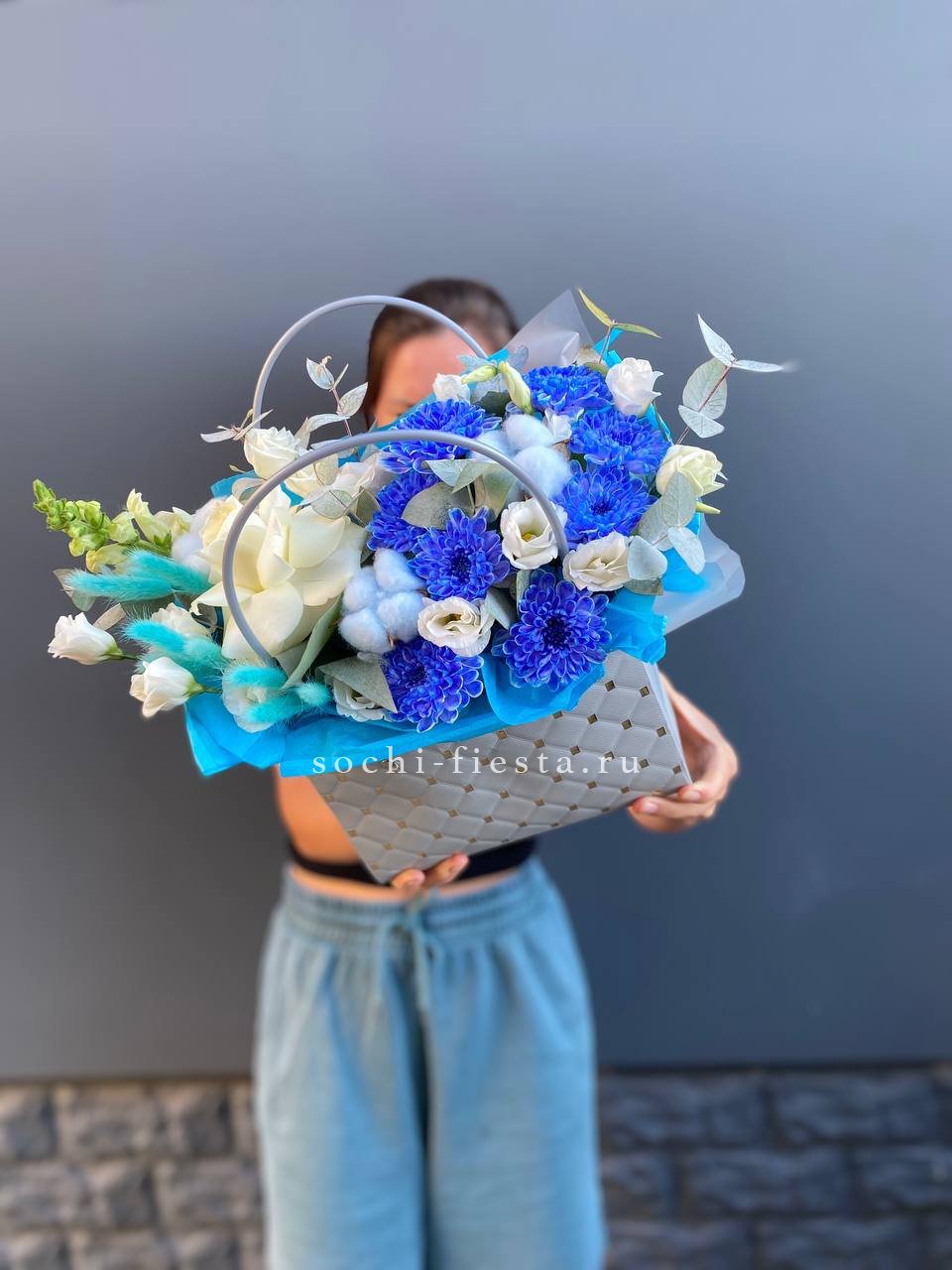 Гортензии задают плотную основу, герберы и диантусы вносят ритм, а альстромерии с эустомой создают движение вверх. Разнообразие форм и оттенков выстраивает многослойную картину в одной сумке.