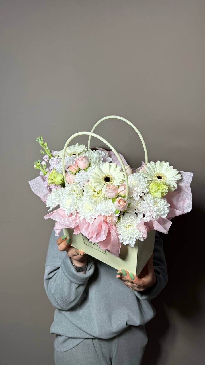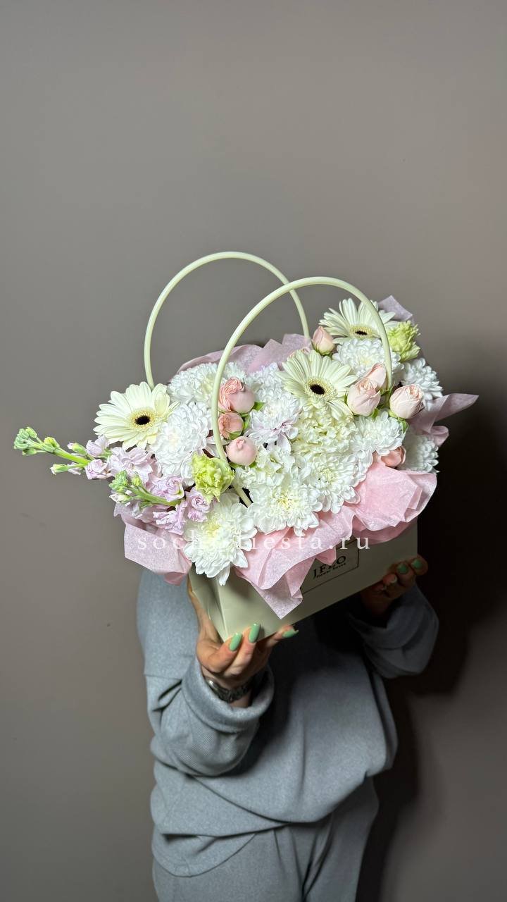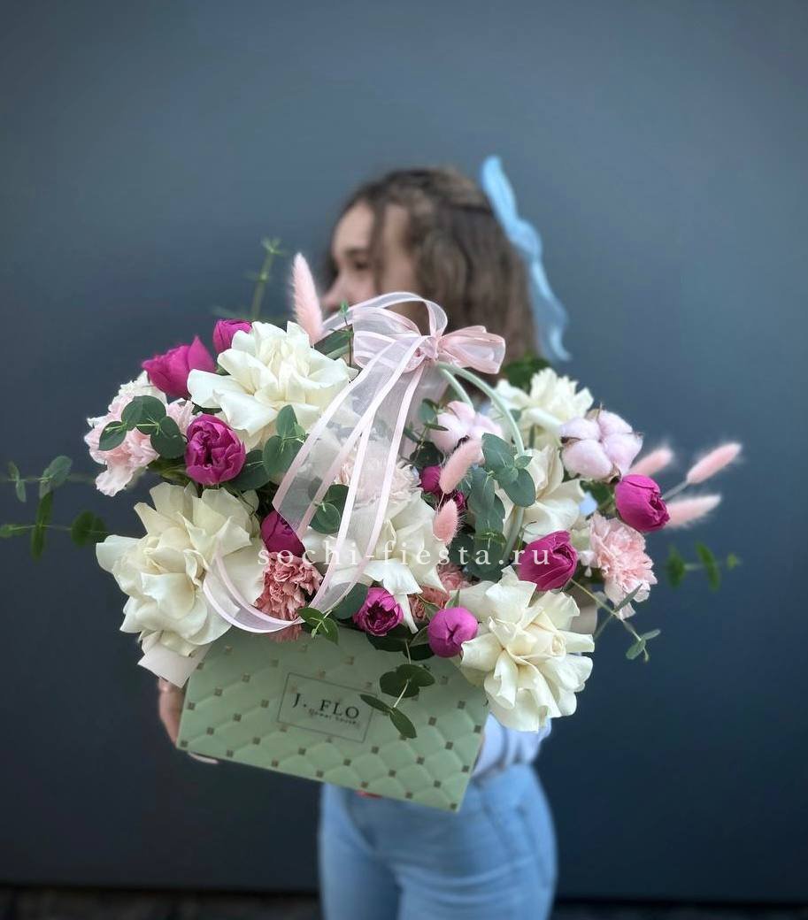 Пионовидные розы Мисти Бабблс раскрываются пышными головками среди диантусов и хлопка. Белые розы создают светлые паузы в композиции. Сумка-кашпо делает подачу мобильной и завершенной.