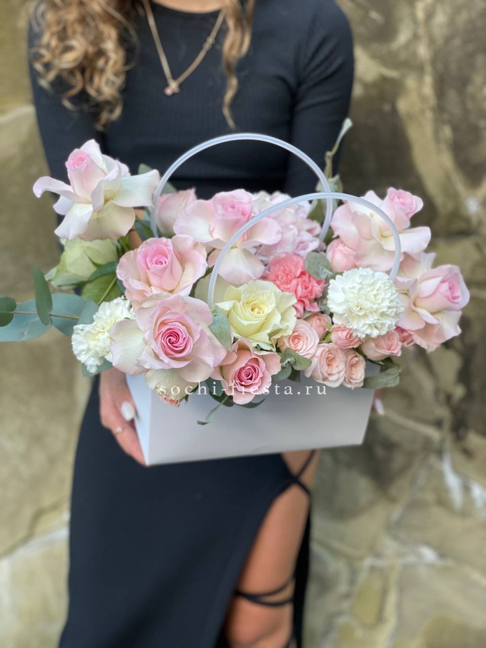 пионовидные розы мисти бабблс, диантусы, белая роза, хлопок, лента, сумка-кашпо.