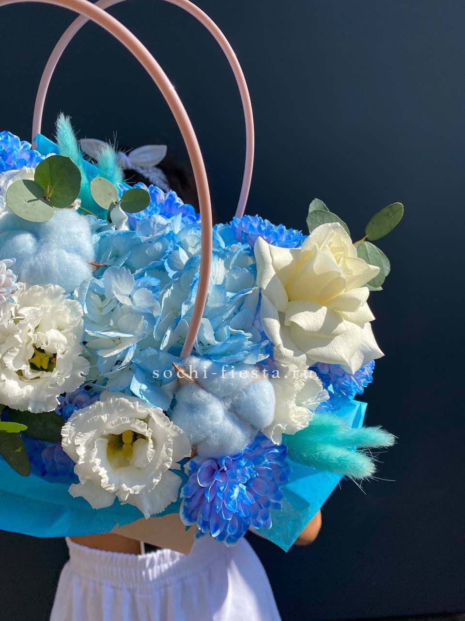 пионы, хризантемы,кустовые розы,лагурус, лента, сумка-кашпо.