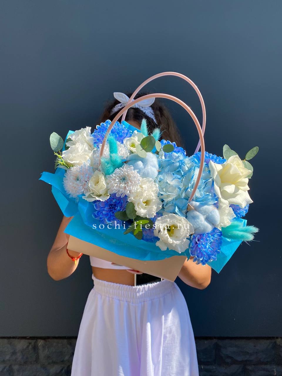 Пионы раскрываются среди кустовых роз и хризантем, а лагурус добавляет мягкие текстурные акценты. Сумка-кашпо с лентой удерживает форму и позволяет композиции сохранять объем. Сезонное сочетание с природной гармонией.