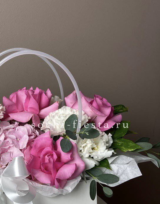 Гортензия и джумилия соседствуют с герберой в удобной сумочке. Разная плотность бутонов создает живую игру объемов и переходов от воздушного к плотному.