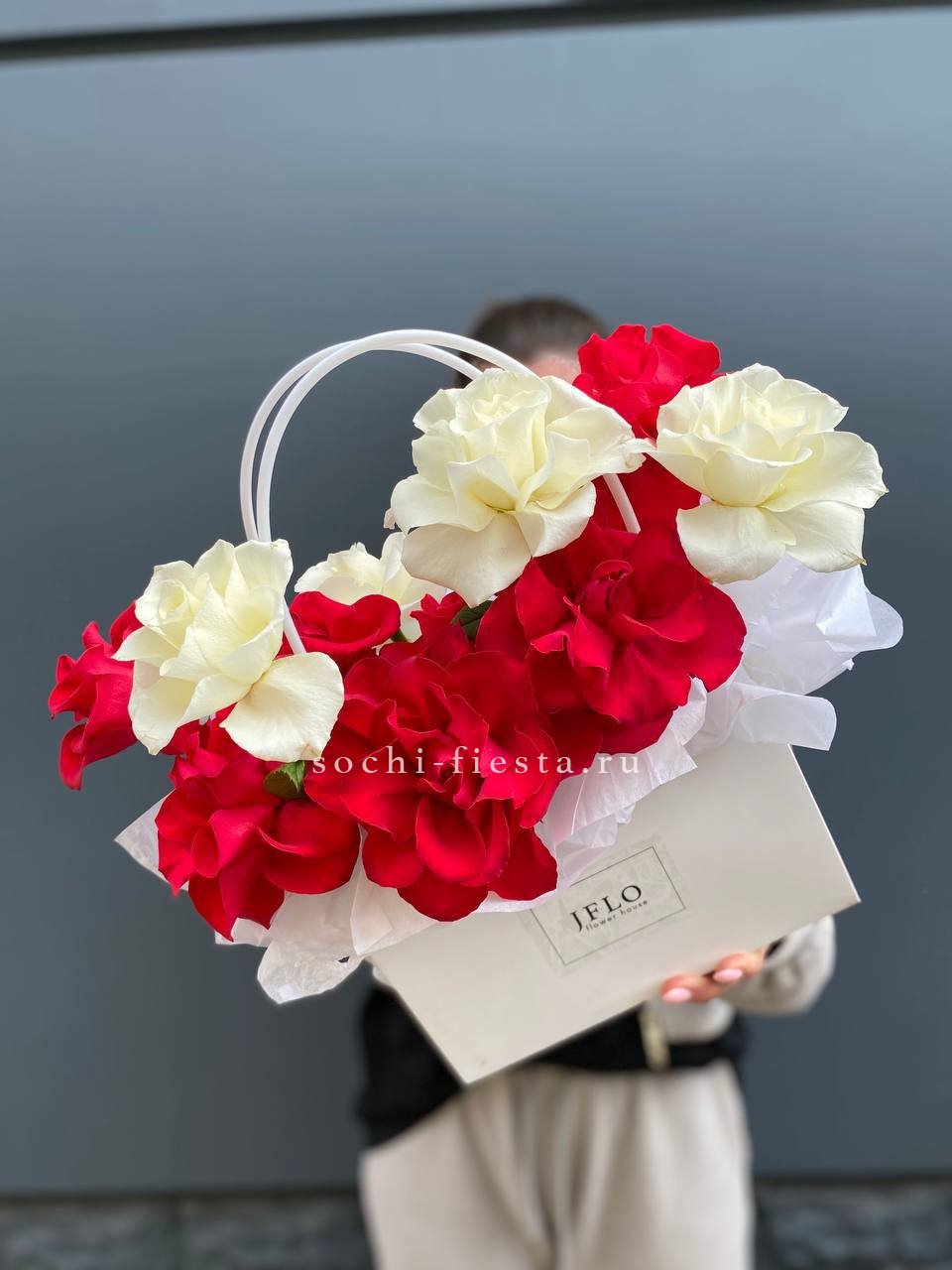 Розовые розы и диантусы переплетаются с кустовыми хризантемами в плотной округлой композиции. Альстромерия добавляет графичные акценты между бутонами. Сумочка собирает все элементы в аккуратную форму с естественным объёмом.