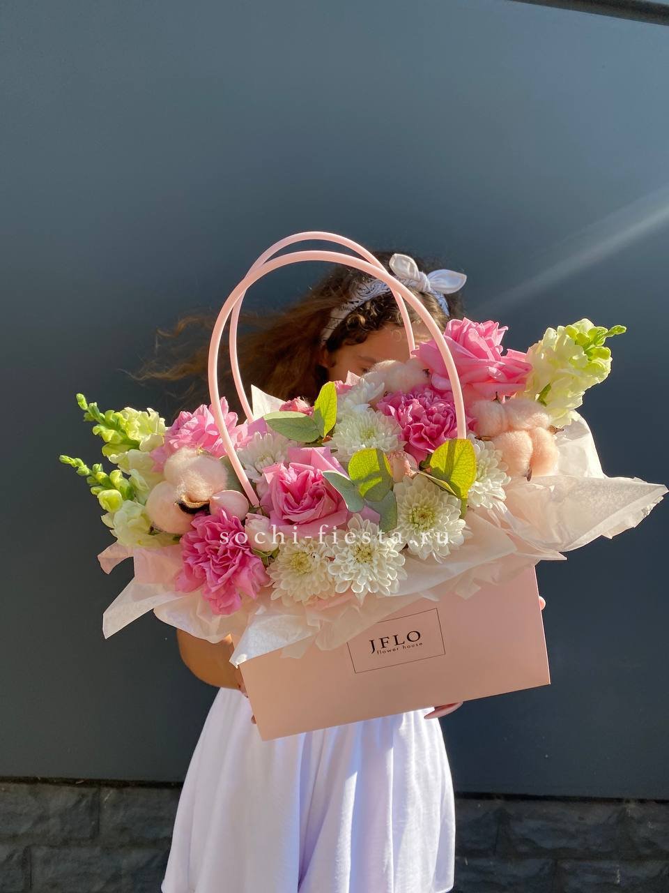 Воплощение изысканности и тренда! Эта стильная композиция в розовой сумочке объединяет в себе яркие цветовые акценты и современный флористический дизайн. Она идеально подойдет для модного образа или в качестве креативного подарка для ценителей необычных решений. Безупречный вкус в каждой детали.