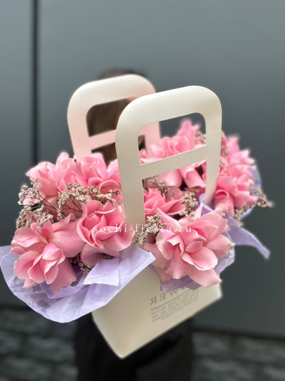 Французские розы собраны в аккуратную форму и помещены в сумочку. Компактная композиция легко помещается на столе или полке, сохраняя свежесть и опрятный вид.