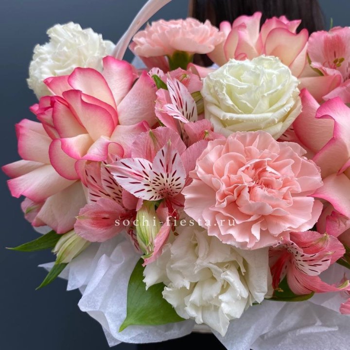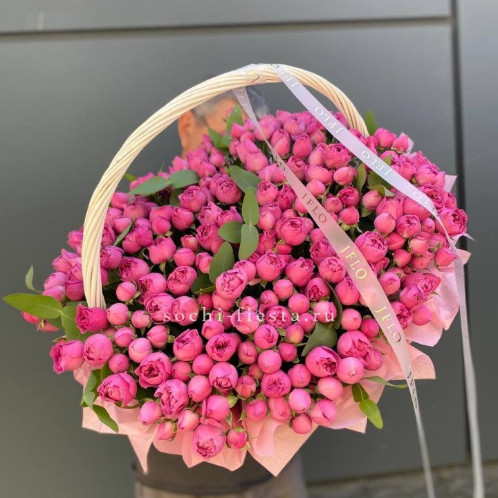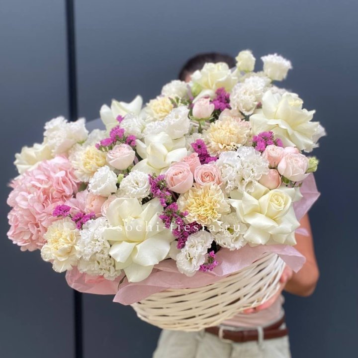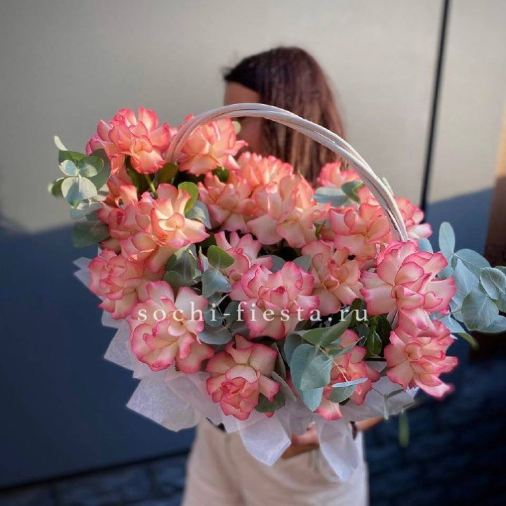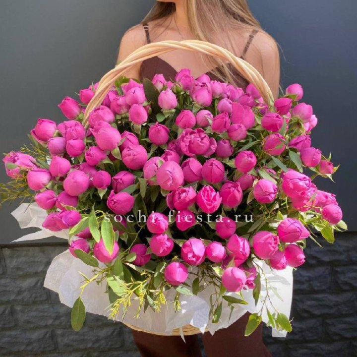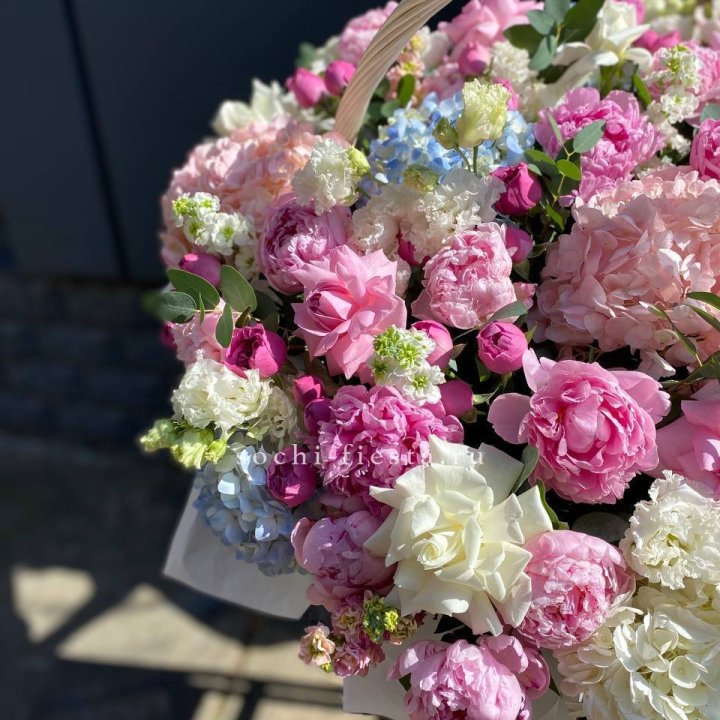 Состав корзин в Вологде определяется текущими поставками и сезоном. Розы Freedom, Mondial, Cappuccino — для классических куполообразных аранжировок. Пионы в мае-июне из свежих поставок: Sarah Bernhardt, Red Charm, Bowl of Cream — главный сезонный продукт. Хризантема, альстромерия, гербера — для объёмных торжественных наполнений. Эустома, ранункули — для садовых корзин. Флорист строит состав под конкретный запрос.