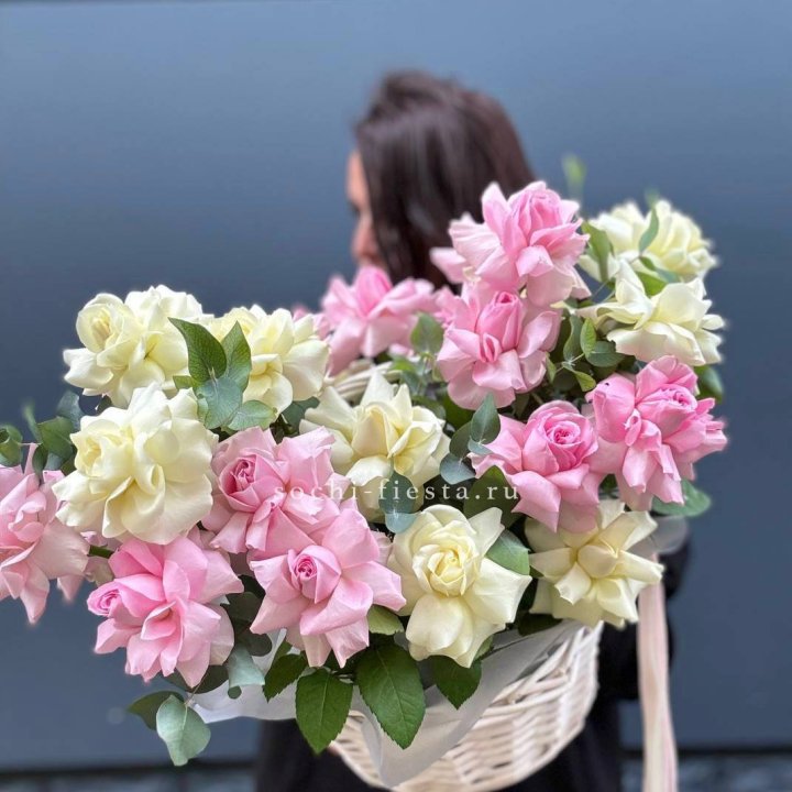Именинная корзина в Вологде — самый популярный частный формат. Флорист создаёт куполообразную аранжировку в плетёной корзине диаметром 35-55 см. Розы или пионы в основе, зелень и декоративные акценты — нарядный объект, который сразу создаёт торжественную атмосферу. Именно такую корзину несут на юбилей или важный день рождения, когда хотят, чтобы подарок был виден и запомнился.
