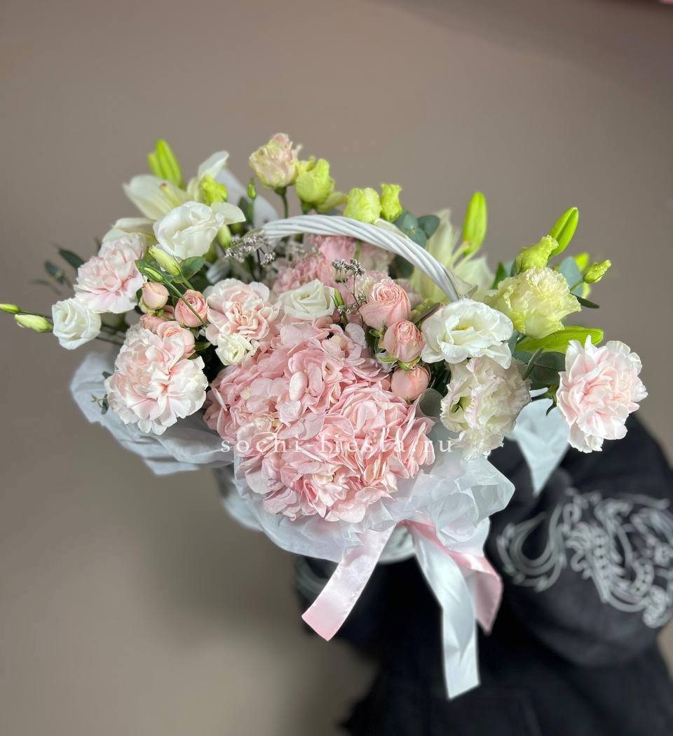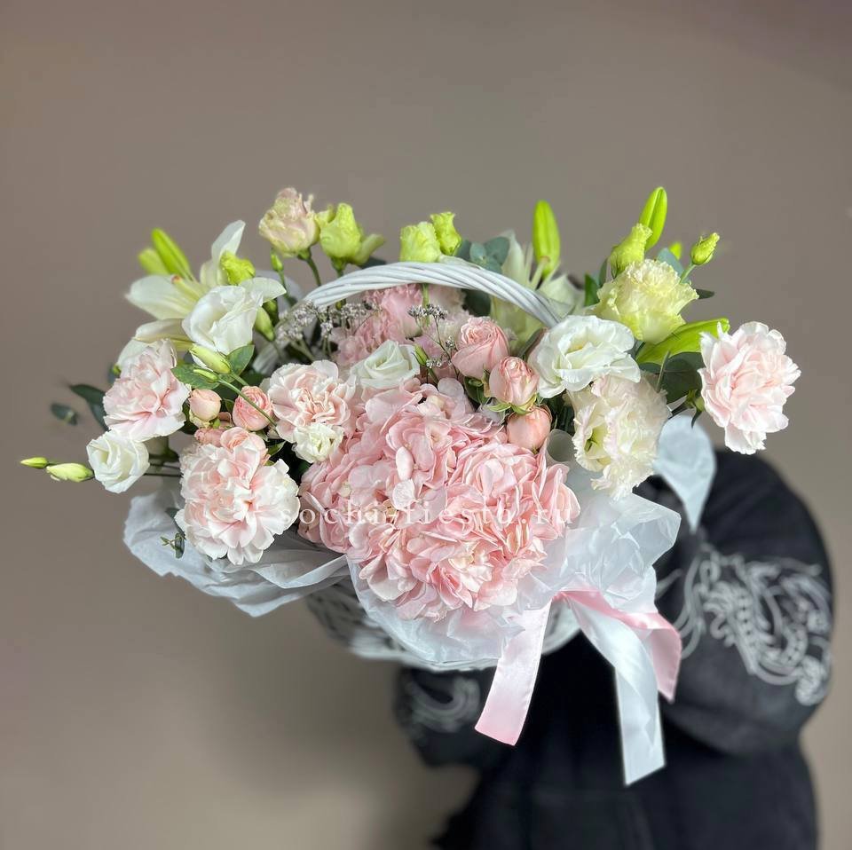 корзина выполнена в нежно-сиреневых тонах с применением декоративной зелени Состав: диантусы, эустома, эвкалипт, декоративная зелень,розы лента, светлая корзина.