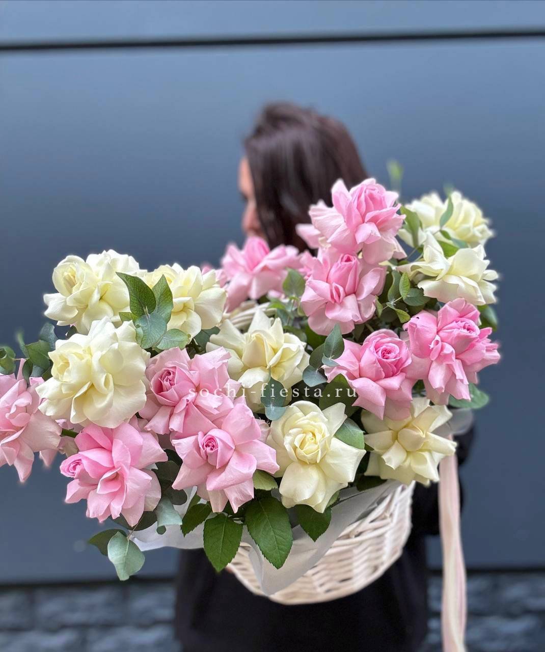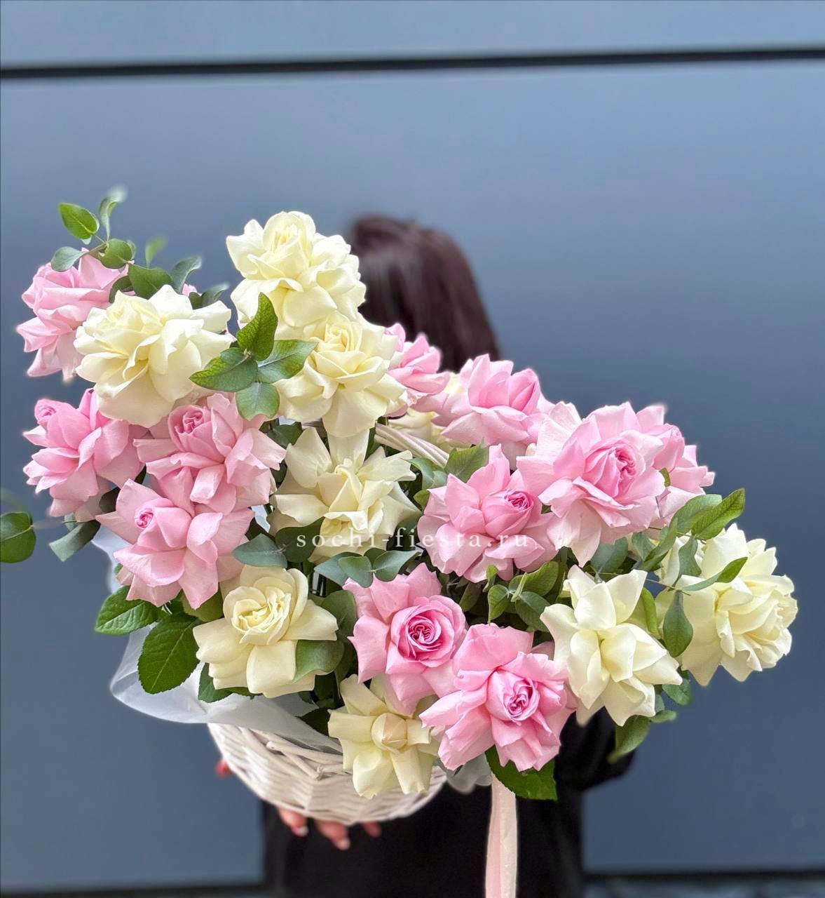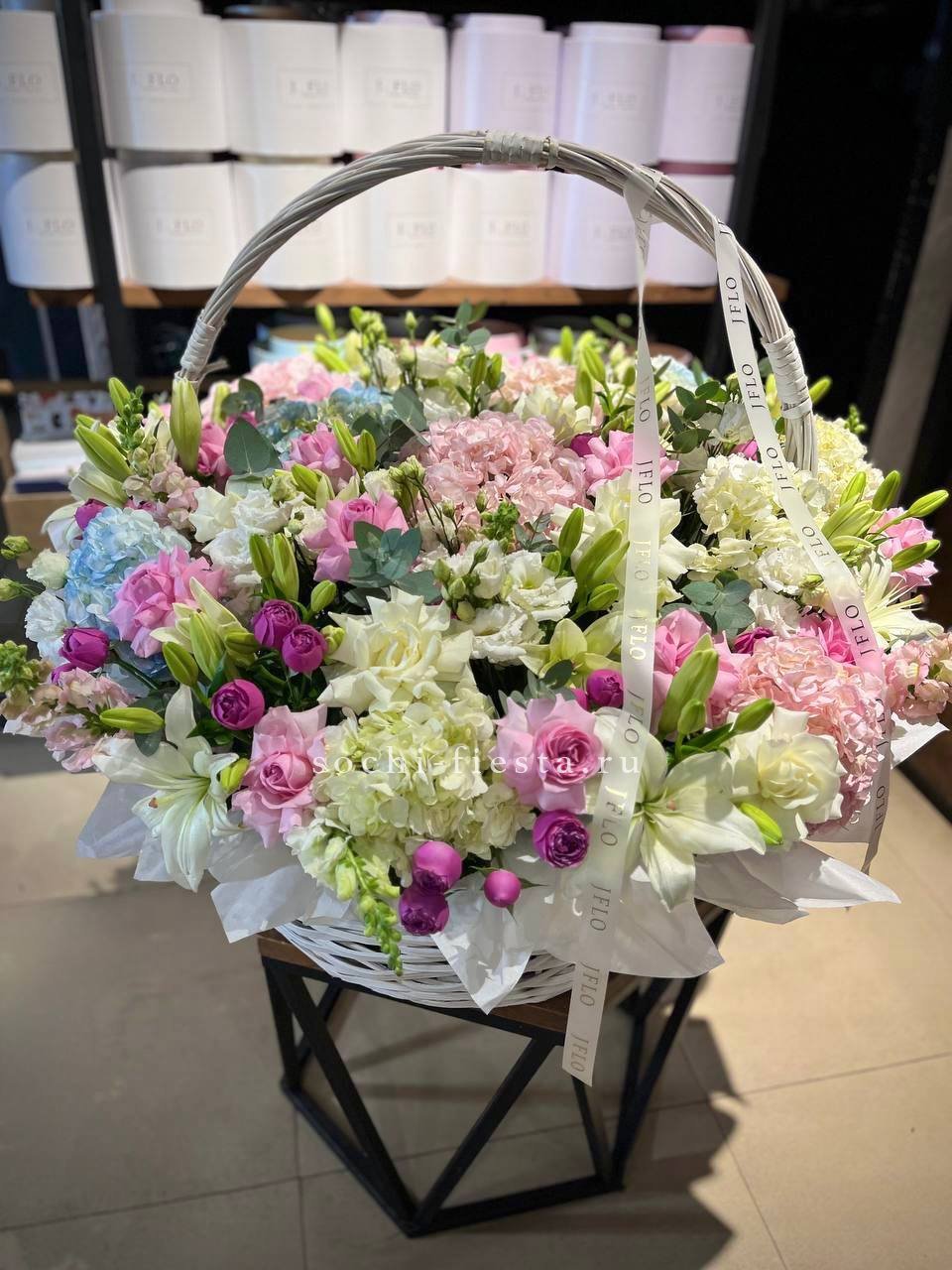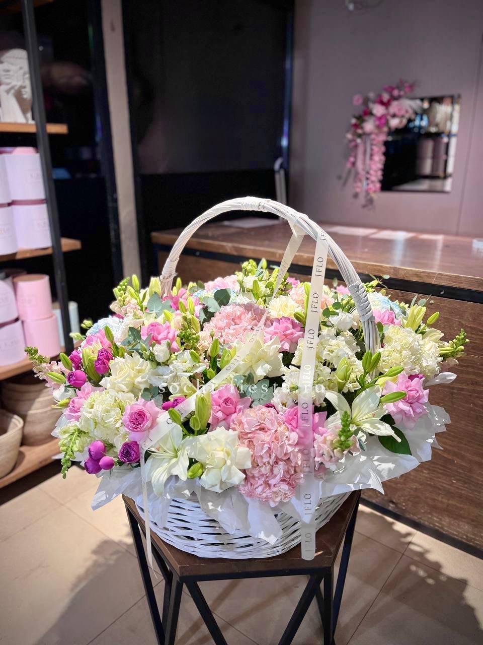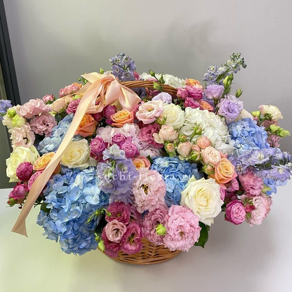 Корзина объединяет гортензии, эустомы, розы и маттиолу в многослойную композицию. Разные фактуры лепестков создают визуальную глубину и насыщенность.