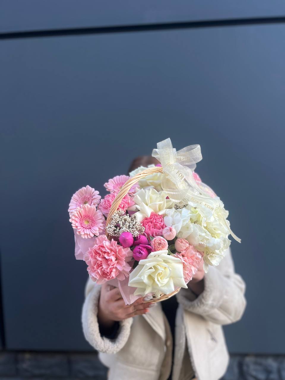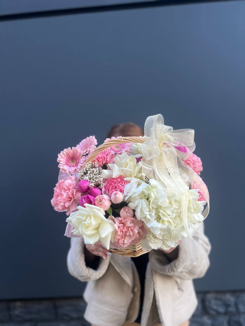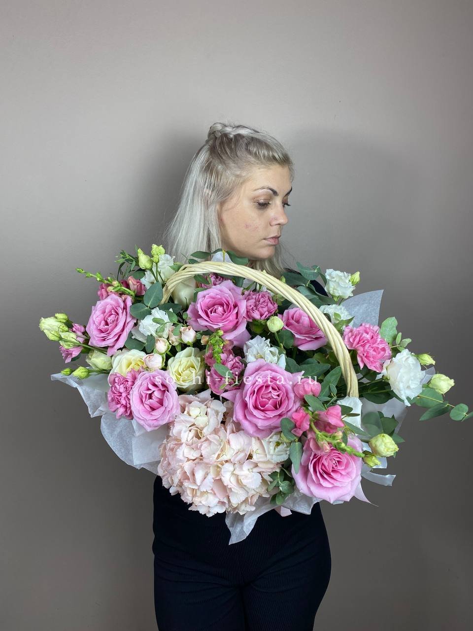 Пышная корзина с розами и гортензией раскрывается мягкими переходами розовых тонов. Эустома и диантус добавляют воздушности, а эвкалипт создает свежую основу для многослойной композиции. Авторская работа для важных событий и значимых встреч.