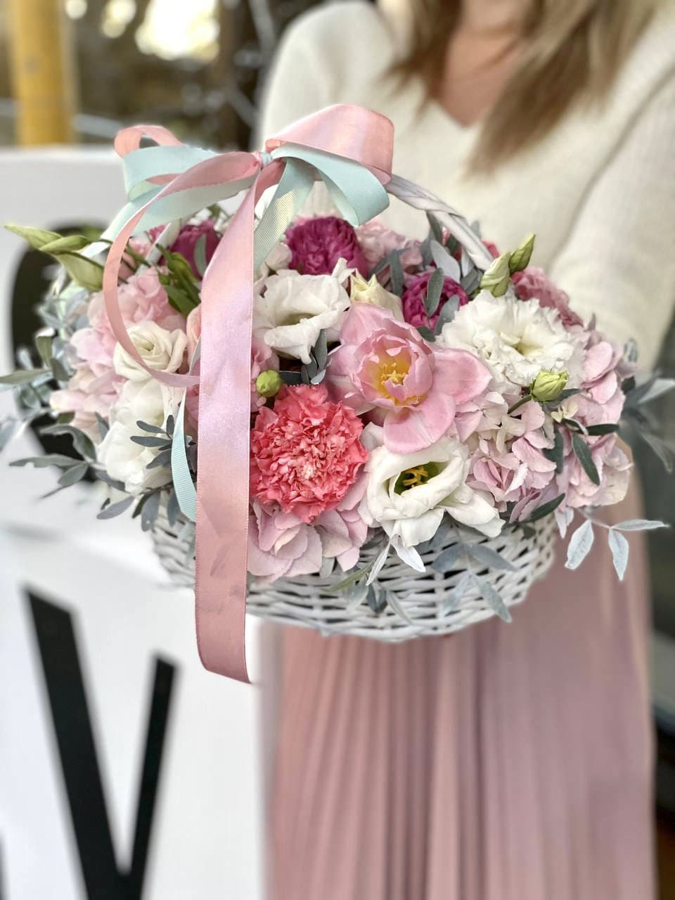 Пышная корзина с французскими розами цвета утренней пудры окружена мягкими ветками эвкалипта. Бутоны собраны плотной шапкой, создавая воздушный объем и насыщенное розовое облако. Композиция удобна для размещения на столе или комоде.